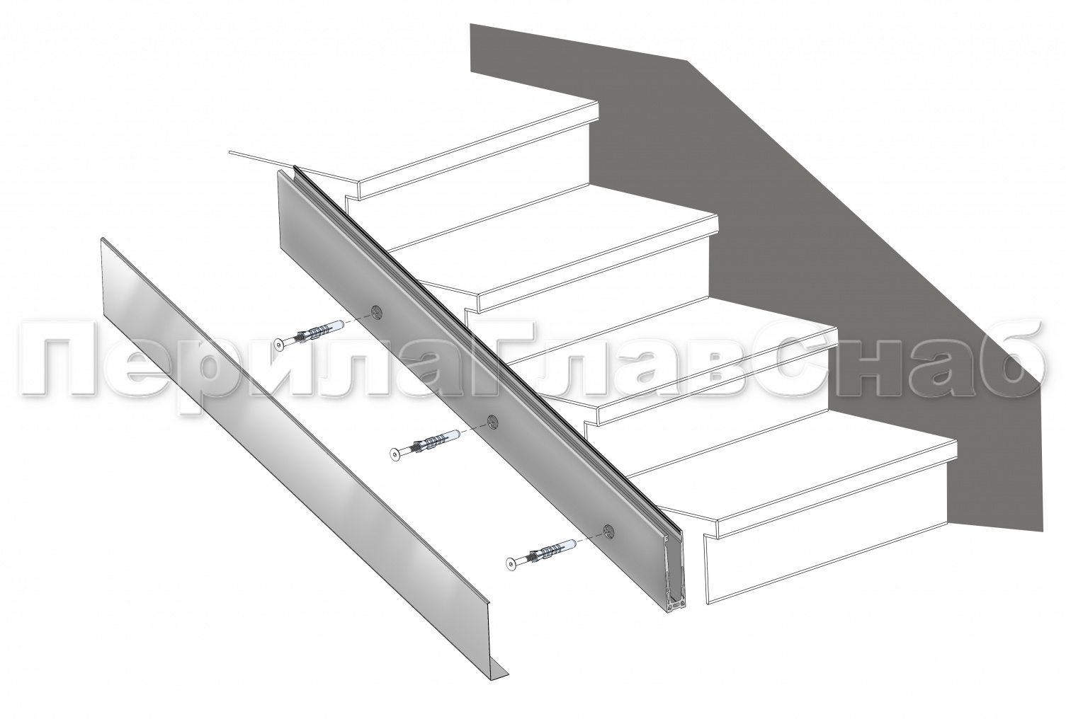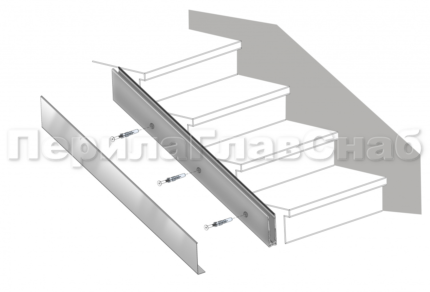 Крепление зажимного алюминиевого профиля в торец лестничного марша. Для скрытия крепежа можно использовать декоративные накладки из полированной или матовой нержавеющей стали.