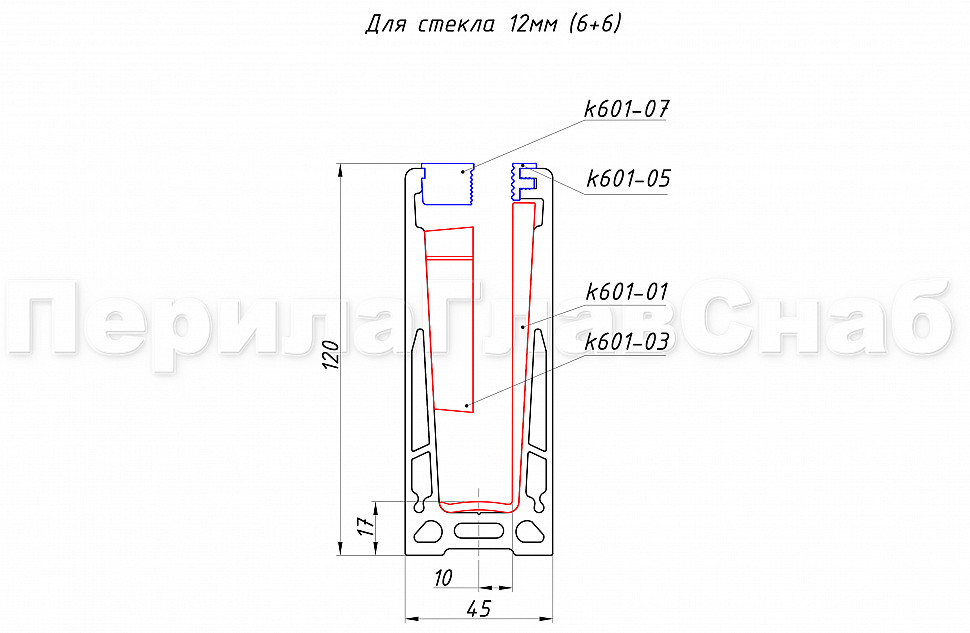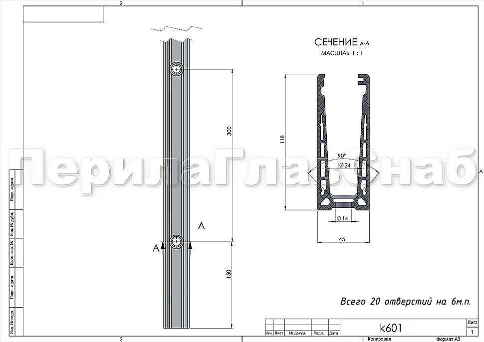 k601 — профиль для ограждений на несущем стекле ( для стеклянных ограждений). Алюминиевый профиль чаще всего используется при строительстве таких объектов, как торговые дома, бизнес-центры, отели, спортивные сооружения. Максимально допустимая высота ограждения может доходить до 1200 мм, боковая нагрузка – до 430 кг. В данной модификации профиля предусмотрены крепежные отверстия. Наличие крепежных отверстий гарантирует более удобную и быструю установку профиля на объекте.