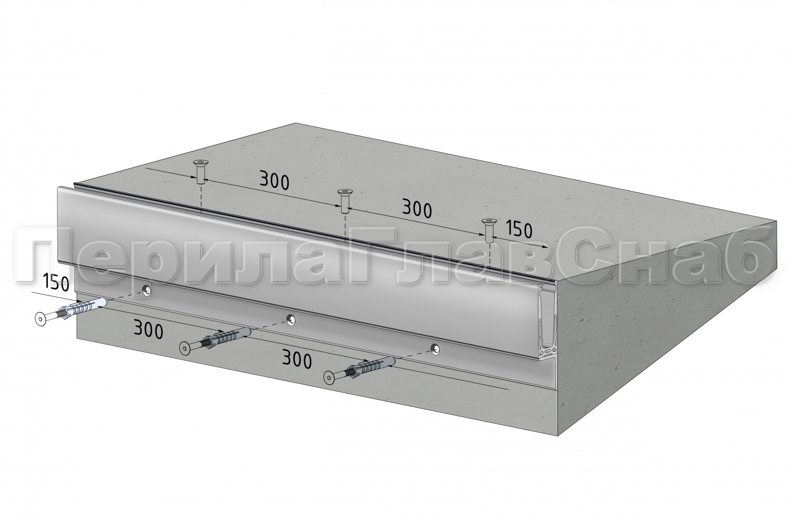 Крепление на горизонтальную поверхность через отверстия, просверленные в нижней части профиля. Для этого мы заранее изготавляваем профиль с уже просверленными на заводе отверстиями с фаской.