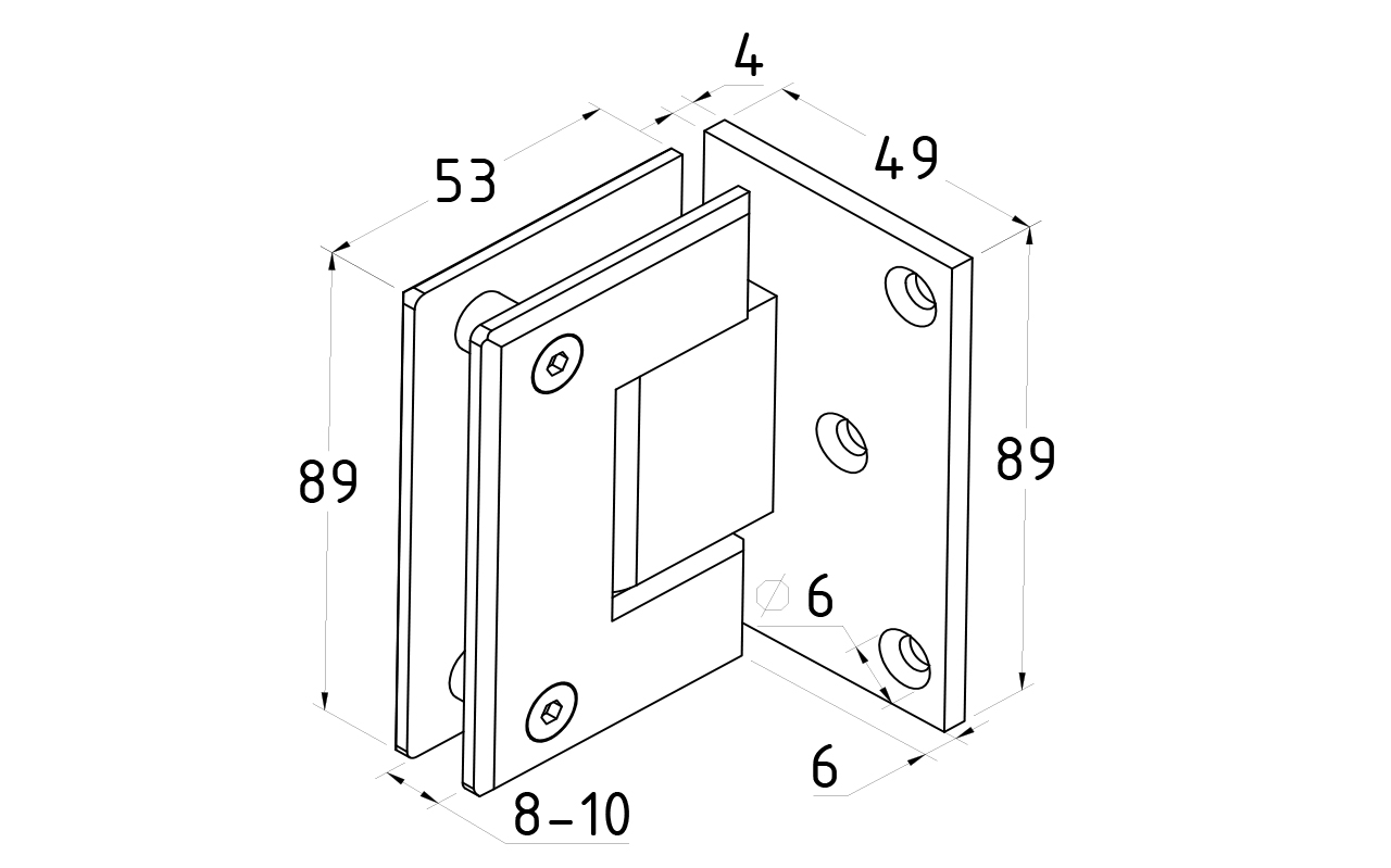 Функция самозакрывание, поворот в обе стороны. Петля стена-стекло крепится с обеих сторон на стеклянные поверхности, плотно прижимаясь к ним металлическими зажимами. Максимальный вес двери на 2 петли составляет 35 кг.