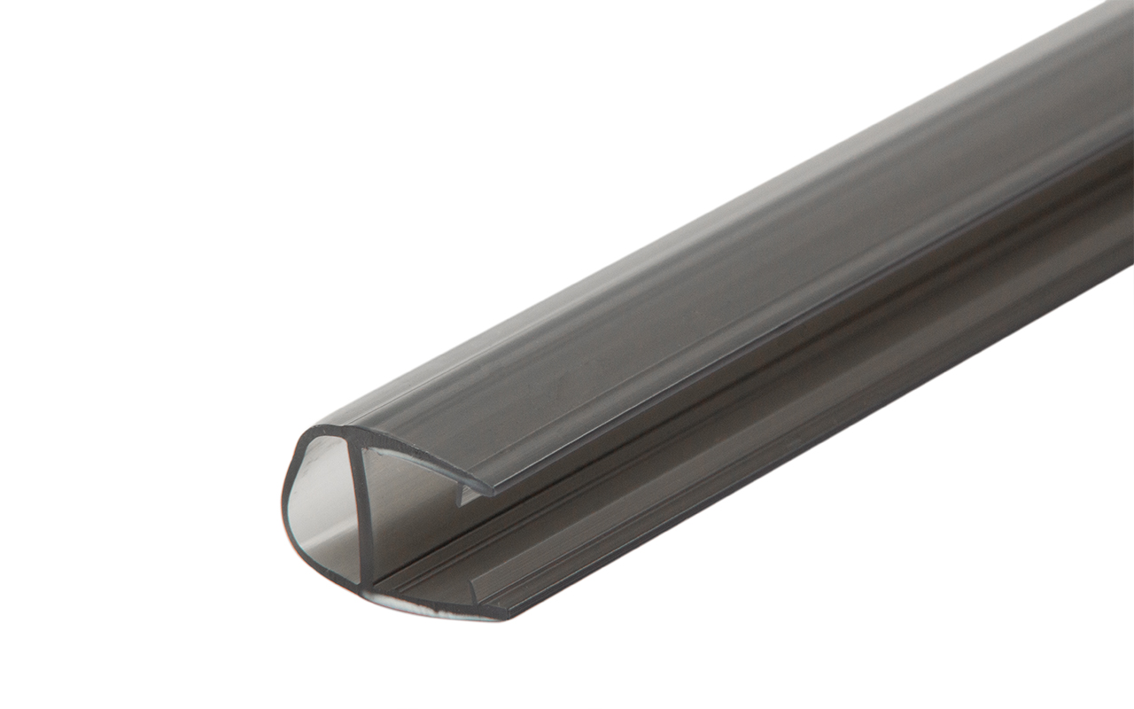 Уплотнитель имеет исполнение полупрозрачной черной поверхности, выполнен из материала ПВХ. Имеет A-образный профиль. Толщина одного типоразмера составляет 1,5 мм, длина – 2200 мм. За счет своих свойств (стойкость к щелочам, минеральным маслам и многим кислотам) прекрасно подходит для крепления стеклянного листа по всему периметру. Позволяет герметично соединять стеклянные панели с дверью, что гарантируют отсутствие течи в вертикальной части конструкции.