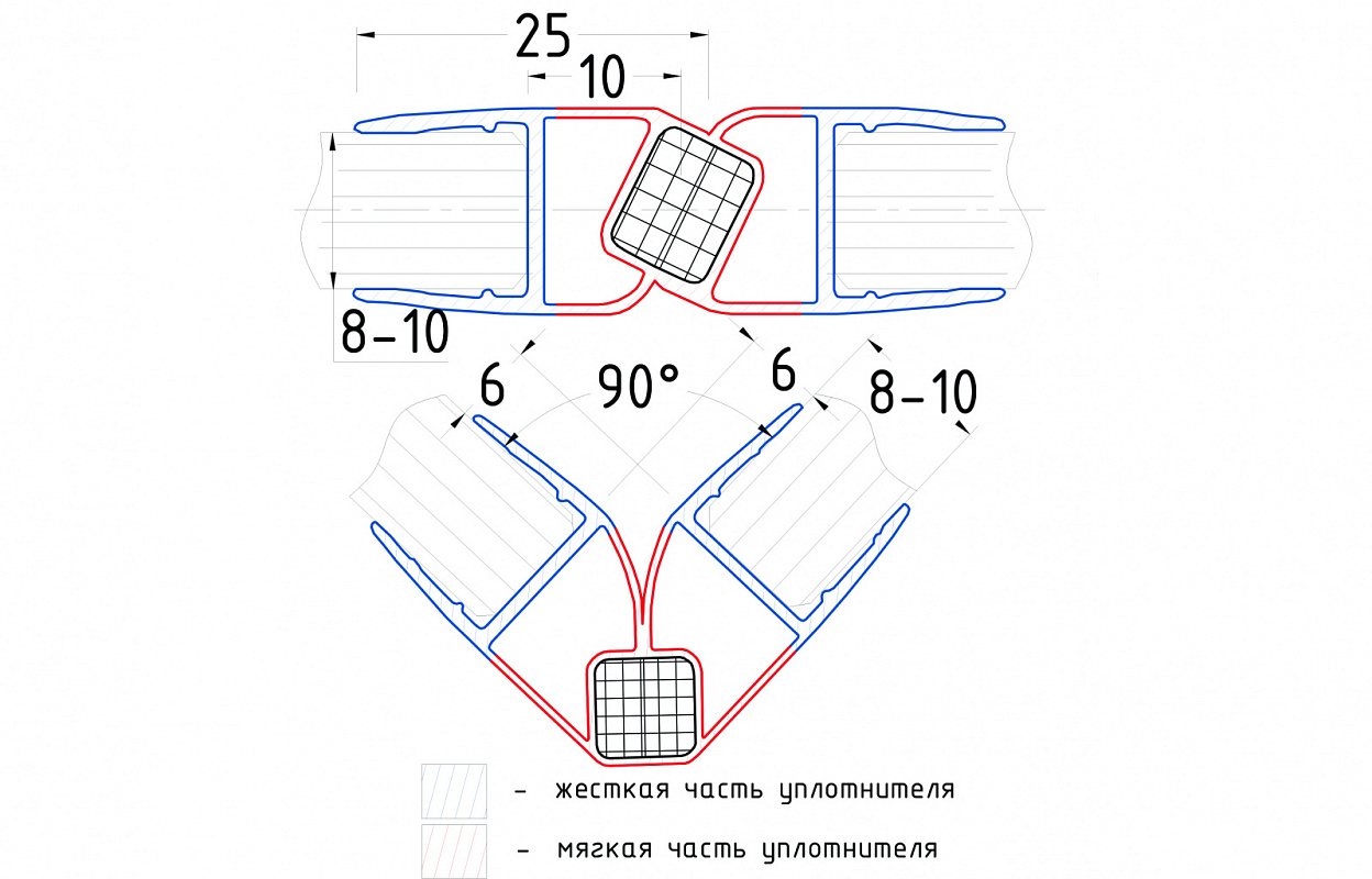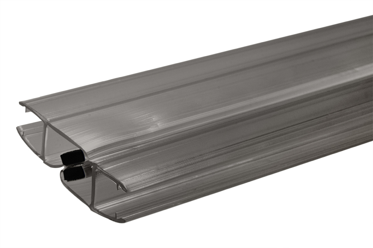 Комплект из двух профилей с магнитом. Монтируется по всему периметру стеклянного листа. Позволяет герметично соединять стеклянные панели между собой благодаря встроенному магниту. Толщина одного типоразмера составляет 1,5 мм, длина – 2200 мм. За счет своих свойств (стойкость к щелочам, минеральным маслам и многим кислотам) прекрасно подходит для крепления стеклянного листа по всему периметру. Применение этого комплекта гарантирует отсутствие течи в вертикальной части конструкции. Уплотнитель из комплекта применим в сочетании со стеклом толщиной до 8 мм и углом в плане до 90 и 180.