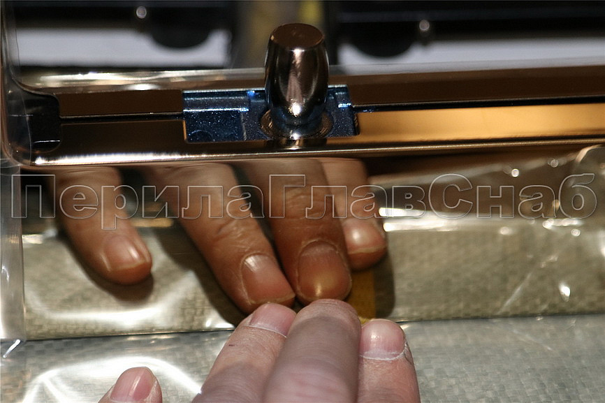 сбоку нажимаем на крепления крышек и снимаем. Отвинчиваем винты, и фиксируем фитинг в подготовленный вырез в стекле. Далее закручиваем и фиксируем обратно крышки.