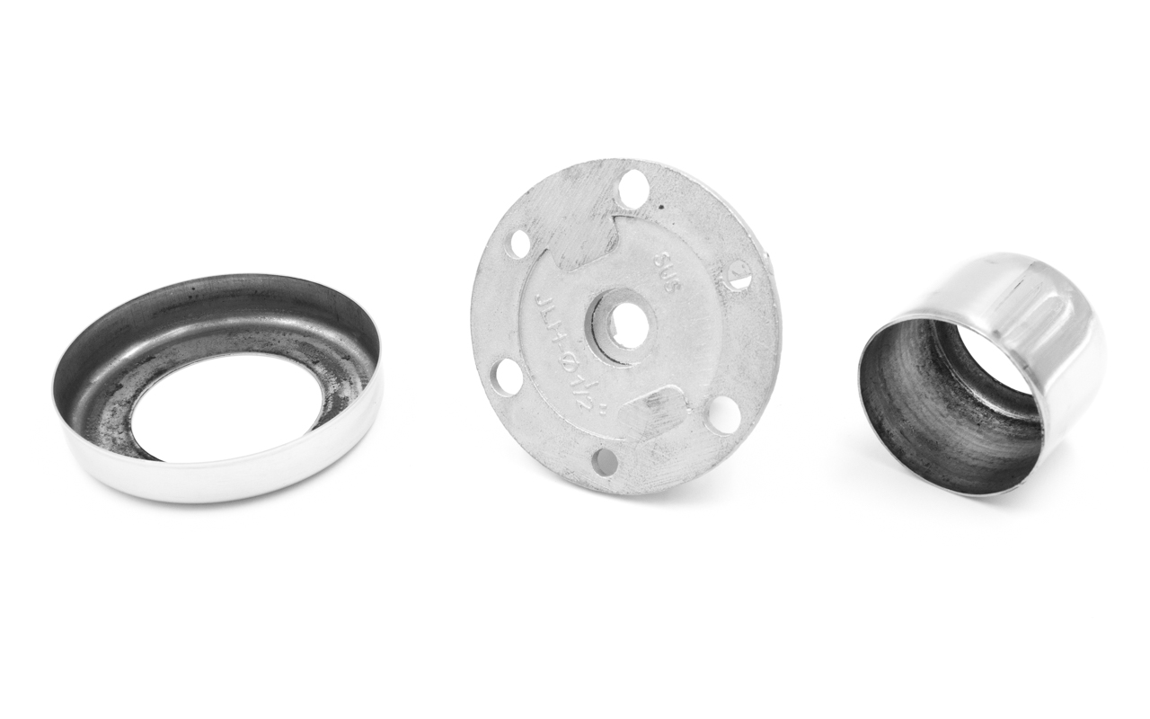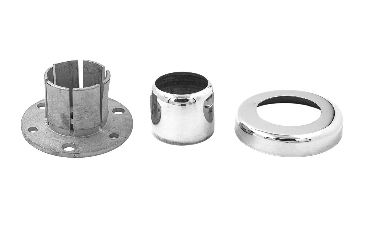 Цанга для крепления стоек из трубы Ø38.1 мм ( k819 и k849). Крепится на 3 анкера М8 или на один по центру для надежной установки на деревянную ступень, плитку, бетон. В комплект входят две декоративные крышки.