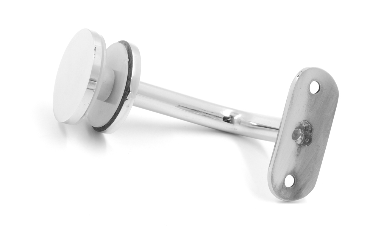 Для установки бокового держателя в стекле сверлится отверстие Ø17 мм, затем пристенок фиксируется затяжной гайкой в торце фланца. А сам поручень приваривается к загнутому наконечнику фитинга.
