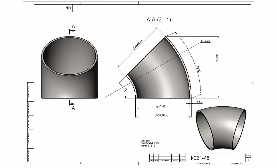 Половинка отвода поручня под сварку для Ø50.8х125/2х1.5, 45°, полированный 400 Grit. Марка стали - AISI 304