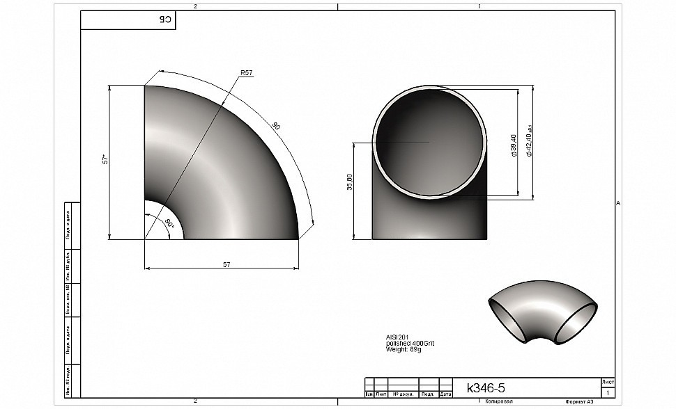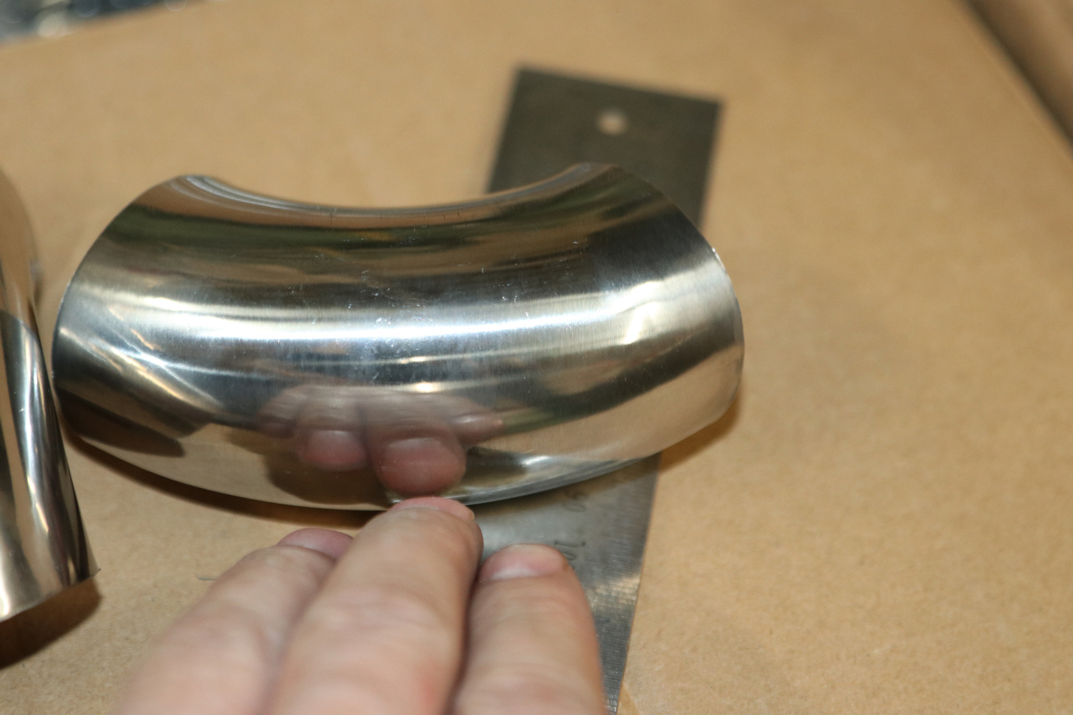 Отвод под поручень диаметром 42.4х90х1.45 мм, 90°. Деталь полированная 400 Grit, марка стали - AISI 201