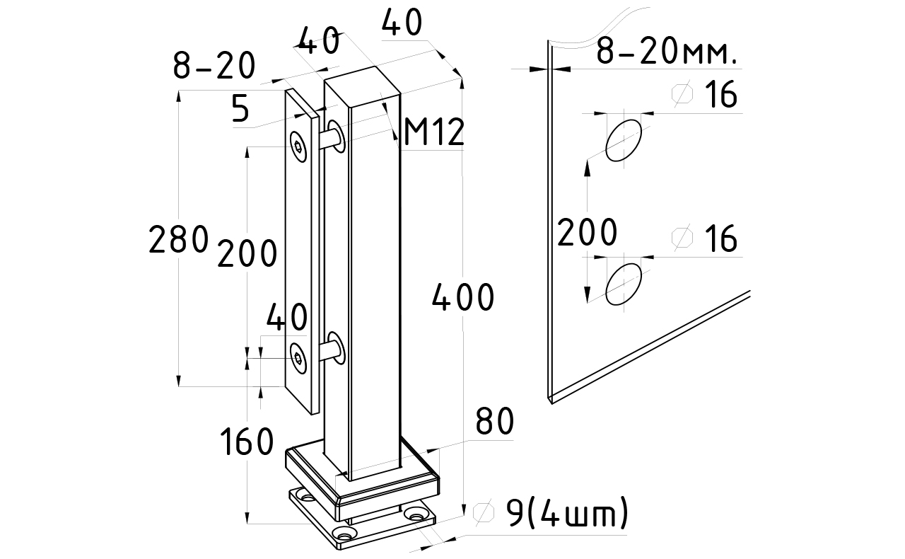 стеклодержатель предназначен для создания ограждений со стеклом 8-20 мм