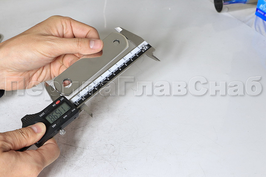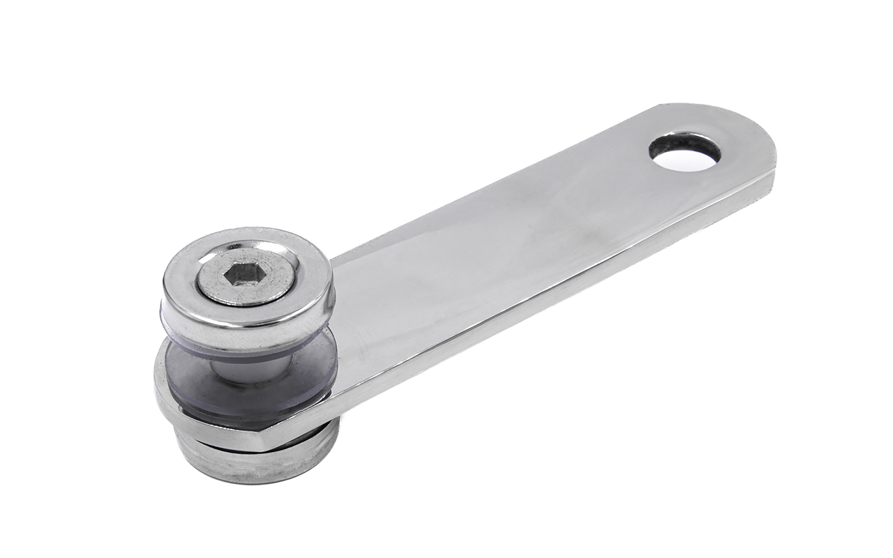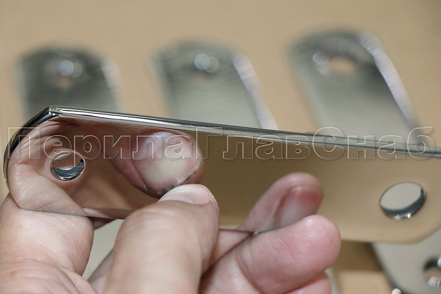 Стеклодержатель пластинчатый 2хМ8 (половинка), по центрам 85х5 мм, полированный, шайбы 5 мм штамп., под стекло 6-12 мм, (AISI 201) k047-1/2
