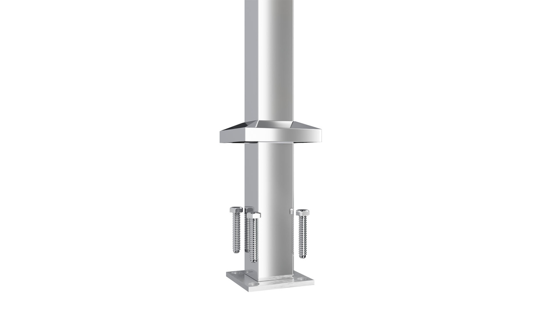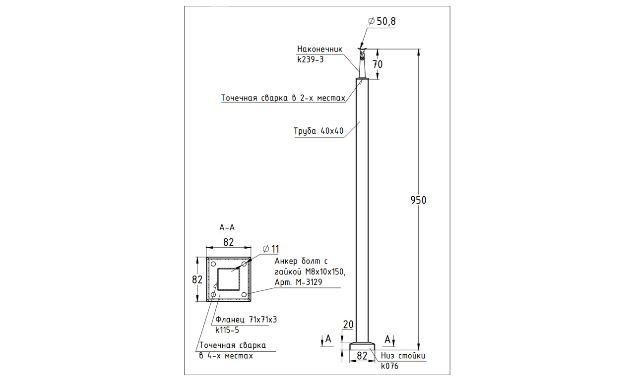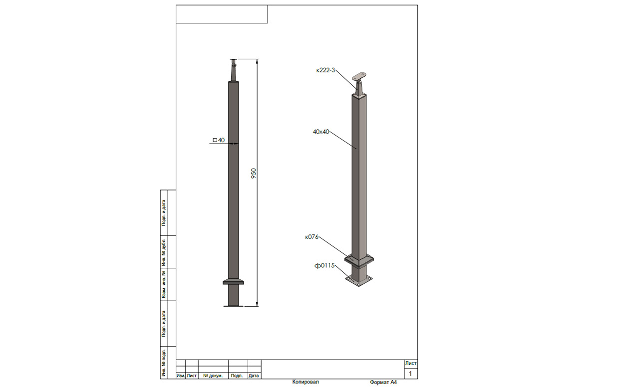Cтойка квадратная 40х40: базовая, полированная, с фланцем, низом стойки и наконечником, высота 950 мм (aisi 304)