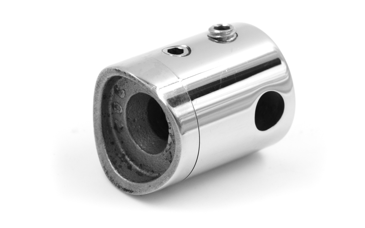 нержавеющий, проходной держатель тросика Ø6 мм, 22х30мм, в виде бочонка на круглую стойку Ø38.1- 42.4 мм, шлифованный (aisi 304)
