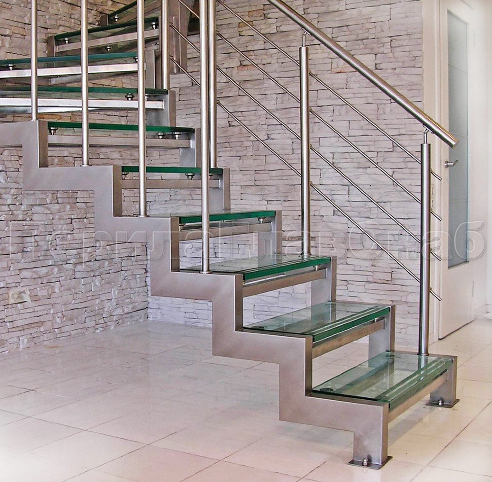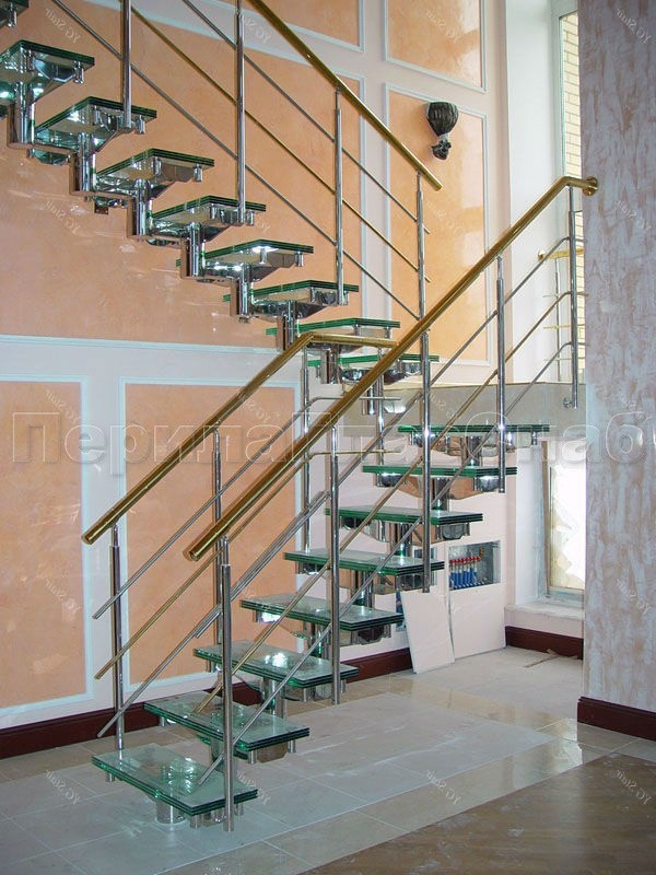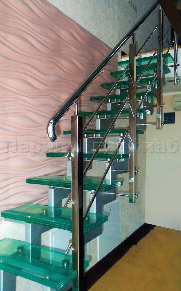Стеклянные лестницы совместимы с современными стилями в интерьере. Перила при этом чаще всего изготавливают из нержавеющей стали. Преимущества таких лестниц: современный дизайн, эффектность и надежность.