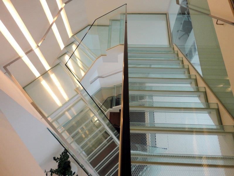 Стеклянные лестницы в стиле хай-тек выполнены из стекла и металла. Они отлично подходят для коммерческих помещений. Если в доме царит промышленный стиль, то они впишутся в интерьер.