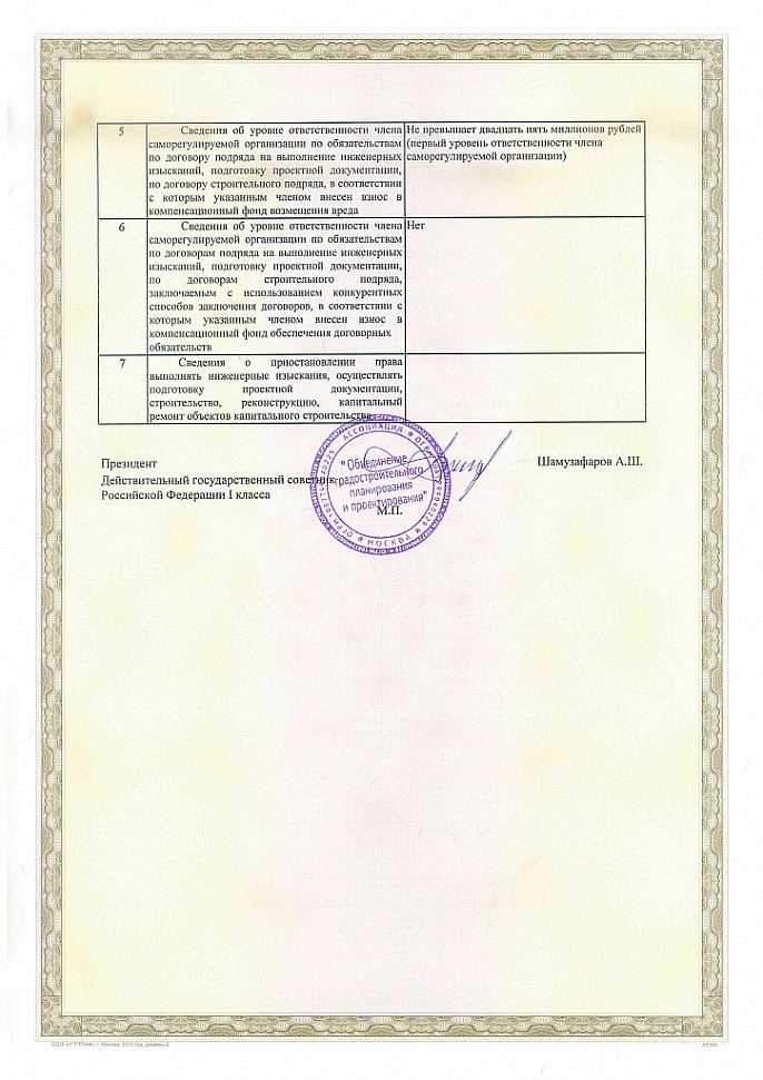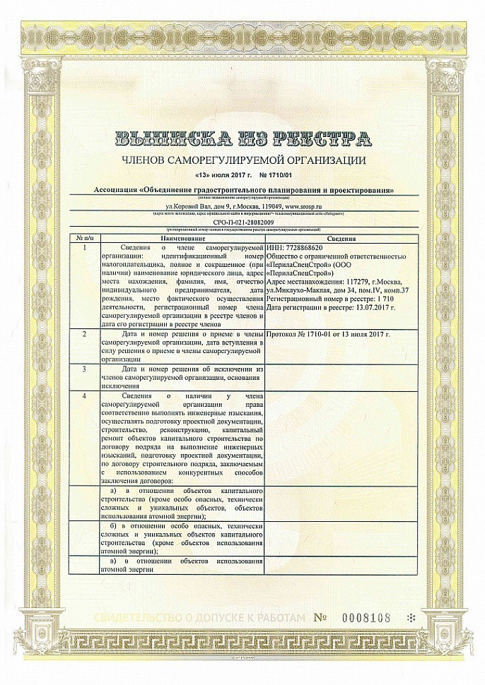 Данный документ, в соответствии со ст. 55.8 Градостроительного Кодекса РФ, подтверждает возможность ООО «ПерилаСпецСтрой» осуществлять подготовку проектной документации по договорам, заключенным с застройщиком, техническим заказчиком, а также лицом, ответственным за эксплуатацию здания/сооружения и региональным оператором.