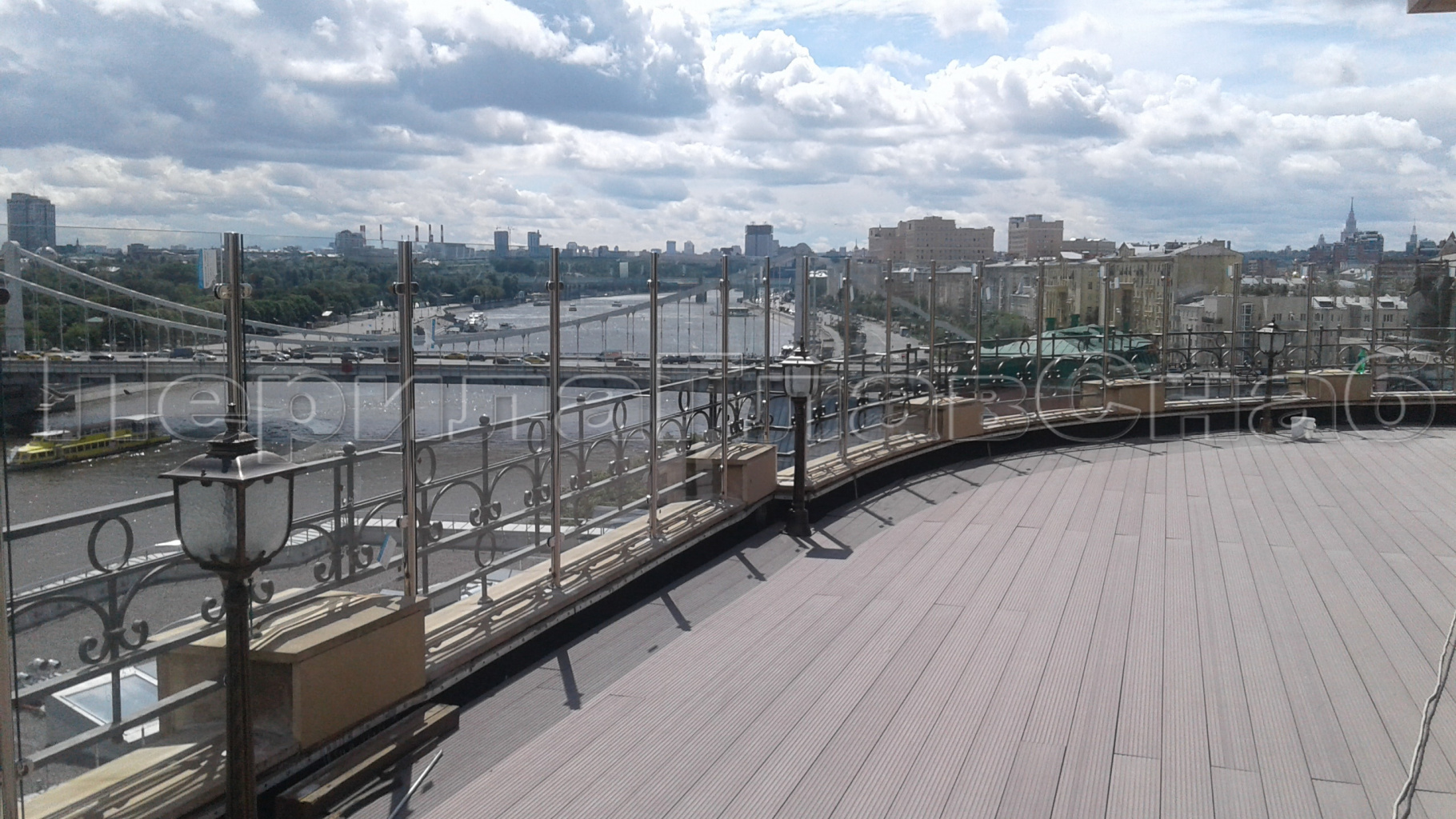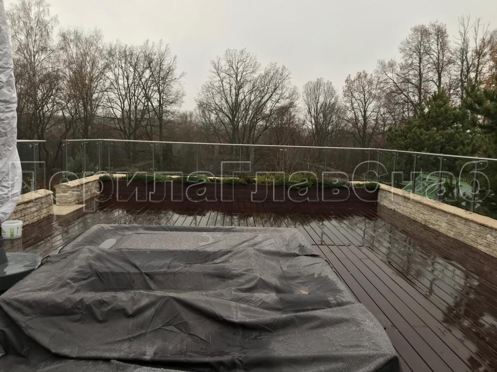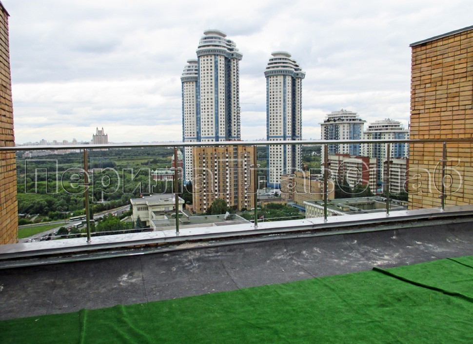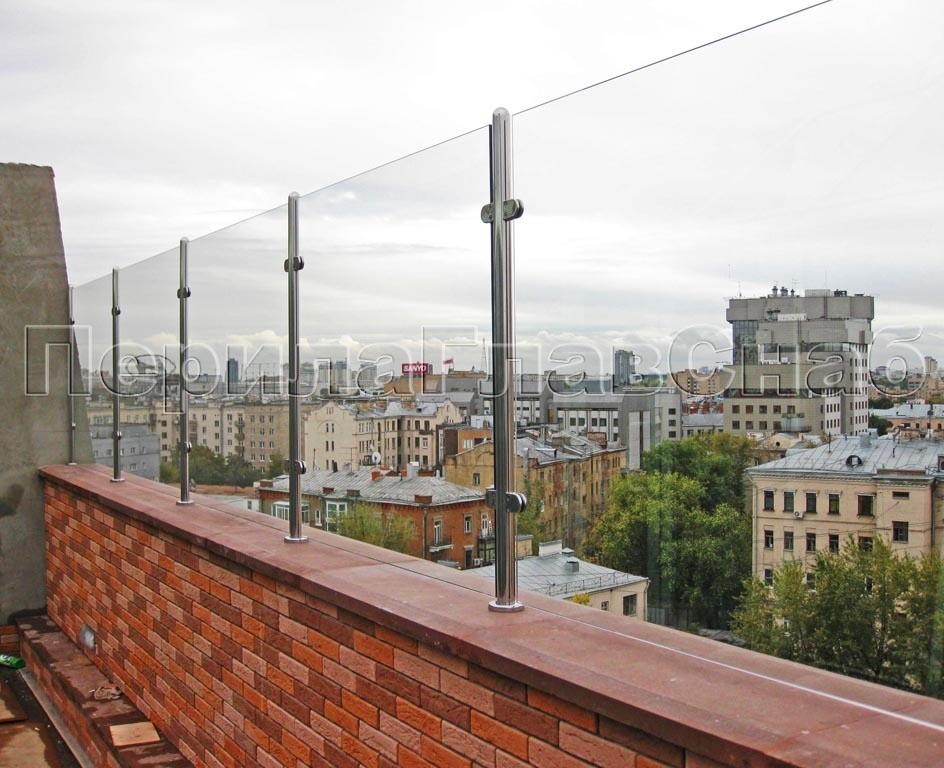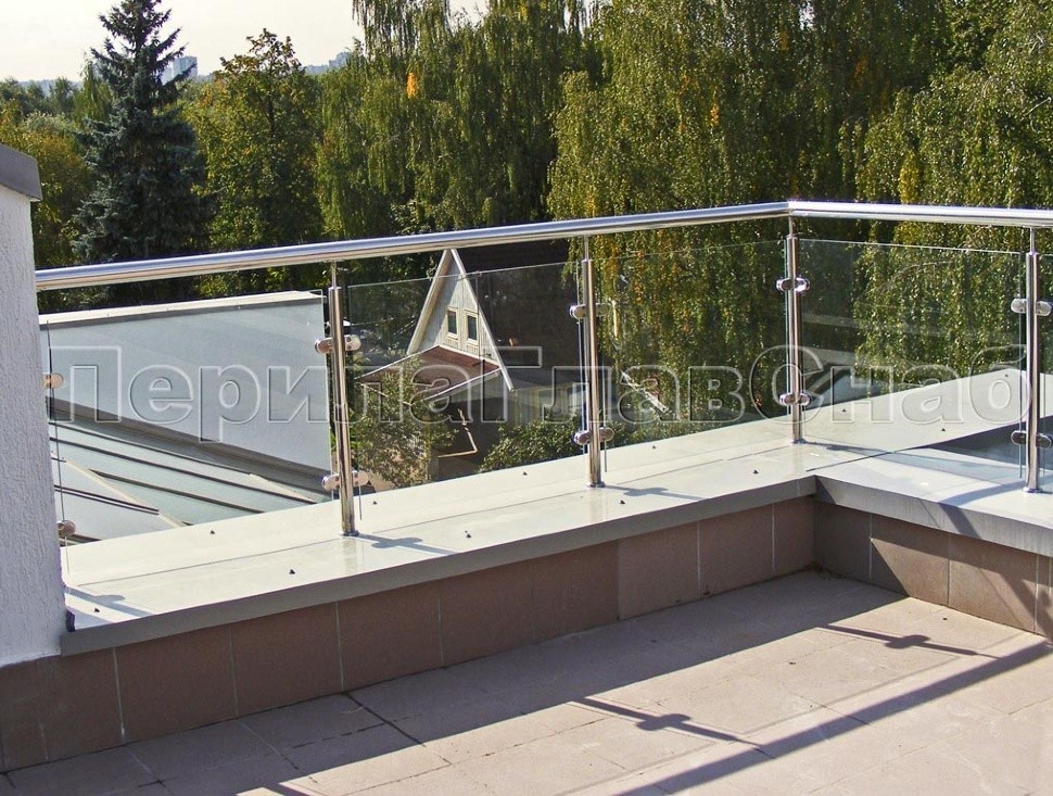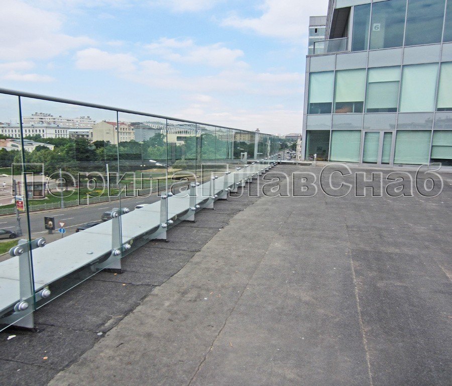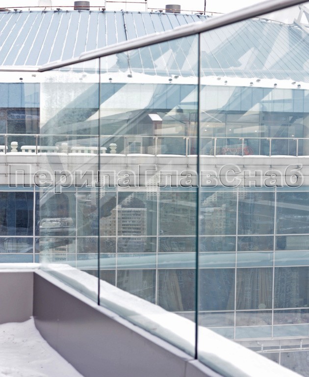 Данный тип ограждений выдерживает большие нагрузки, за счёт увеличенной толщины стекла: триплекс 8 мм + 8 мм закаленный или 15 мм.