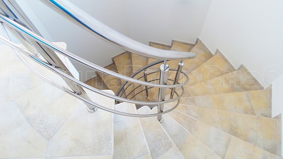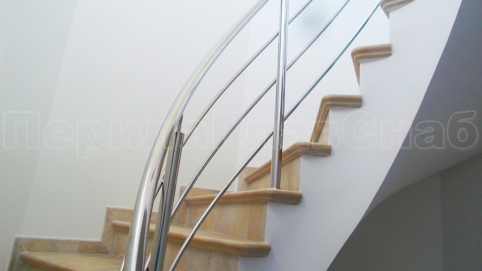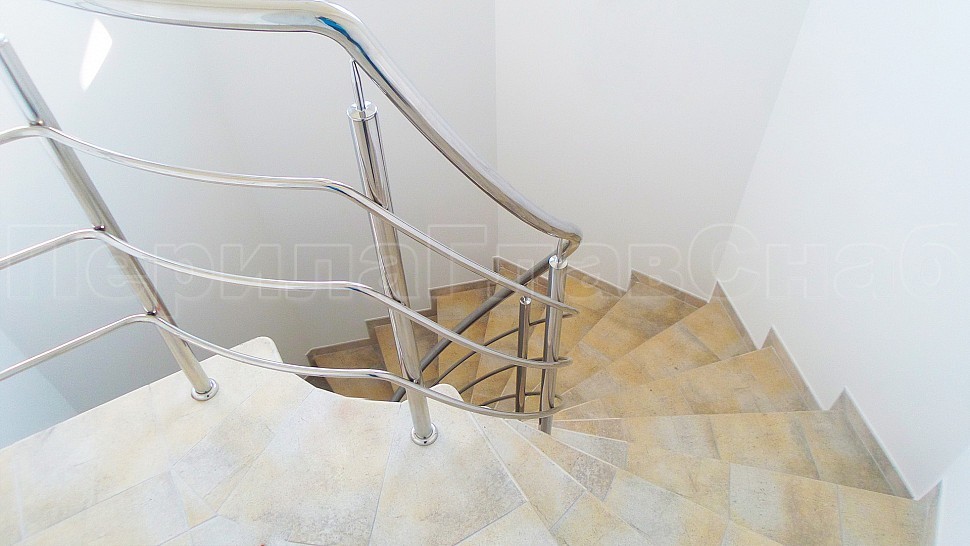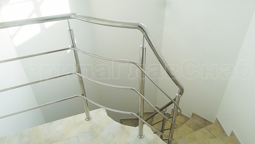 Заказчиком был одобрен предложенный нашими специалистами проект на установку трехригельного ограждения из полированной нержавеющей стали. Также были установлены стойки диаметром 38мм — устанавливаются через каждые три ступени на четвертую. Крепление стоек выполнено методом бурения и вклеивания, на верх стойки устанавливается штырь, а низ, как и окончание поручня, закрывается заглушкой. Поверх стоек установлен поручень из нержавеющей стали — он, как и ригели, завязан по винту. Крепление нержавеющих элементов ограждения между собой выполнено при помощи точечной аргонно-дуговой сварки, длина швов после нее — 2мм, на финальном этапе монтажа швы были зачищены и отполированы.