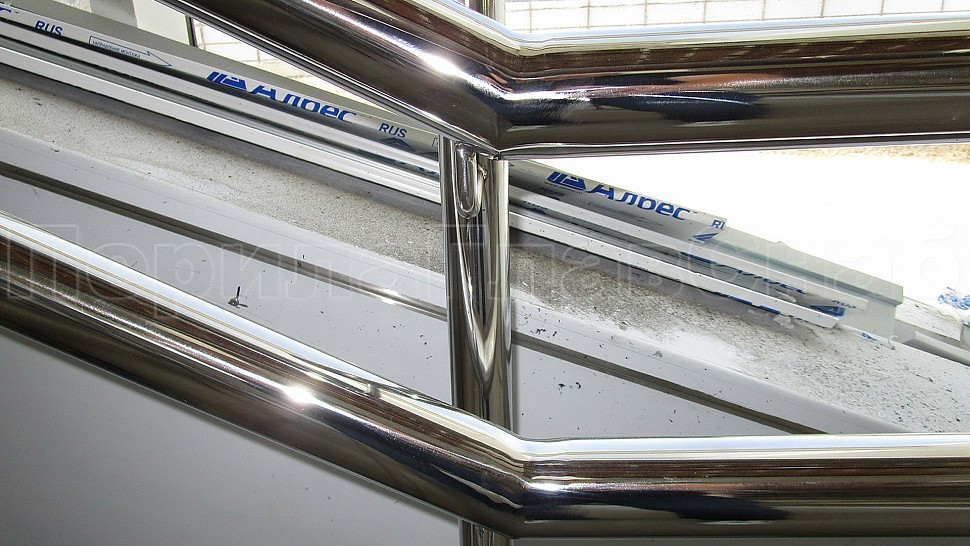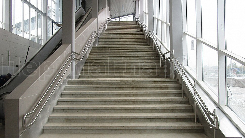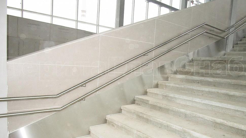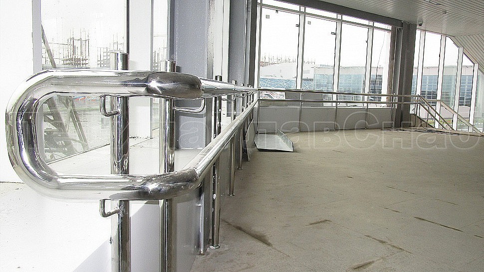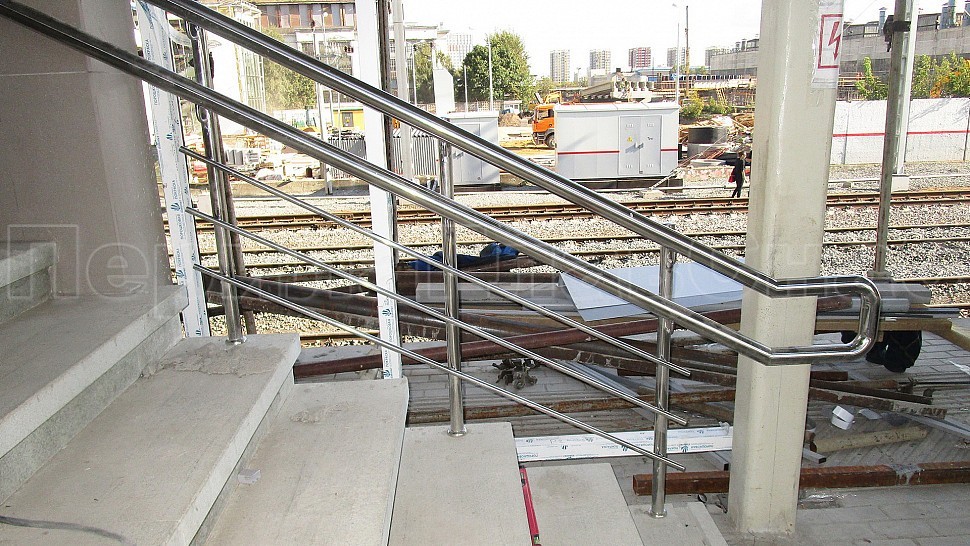 На станции “ЗИЛ” был установлен пристенный наружный двойной поручень диаметром 50,8мм. Поручень выполнен из полированной нержавеющей стали марки AISI 304, крепится к стене на выносных держателях через плитку в бетон на высоте 700мм и 900мм. Сам поручень завязан окончанием “бублик”, а сварные швы зачищаются, шлифуются и полируются. Крепления нержавеющих элементов ограждения между собой выполнены методом точечной аргонно-дуговой сварки, длина швов- 2мм, с последующей зачисткой и полировкой.