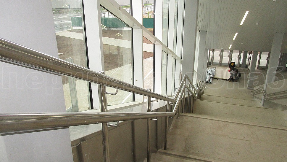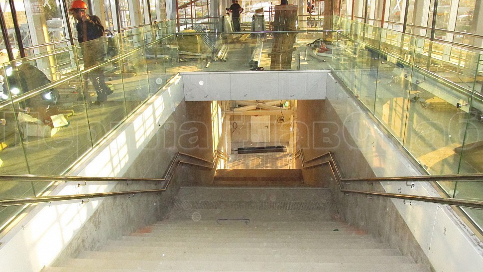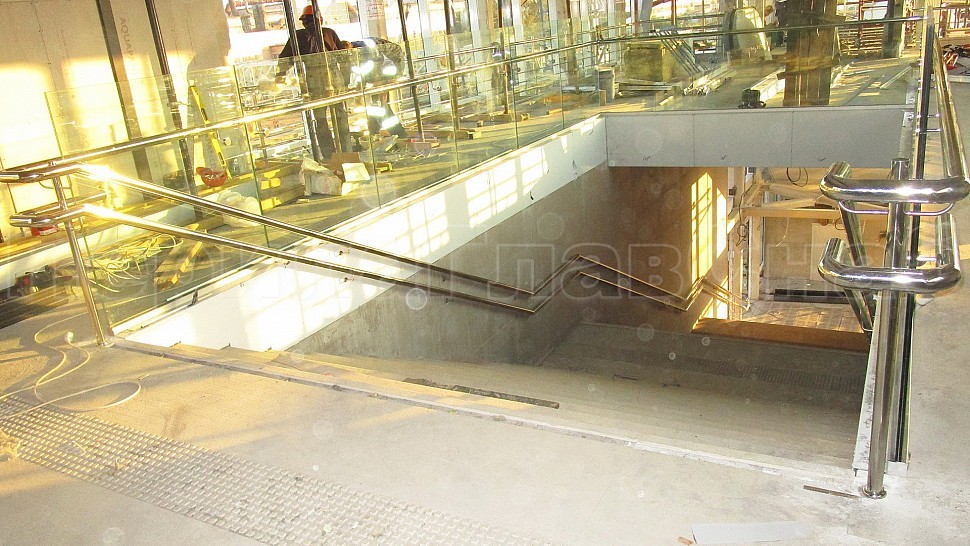 Для станции “Волгоградская” были спроектированы и установлены наружные ограждения высотой 900мм из прозрачного стекла триплекс 8+8мм, с поручнем диаметром 50мм из полированной нержавеющей стали с креплением к стеклу на выносном элементе. Стекло крепится сверху при помощи зажимного алюминиевого профиля. Крепление нержавеющих элементов ограждения между собой выполнено при помощи аргонно-дуговой сварки, длина швов — 2мм, с последующей зачисткой и полировкой.