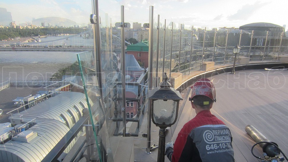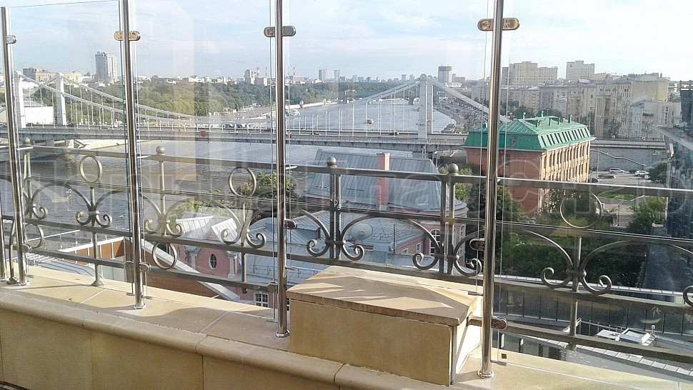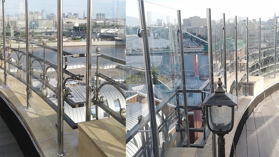 Заказ выполнялся на установку ограждений из полированной нержавеющей стали марки AISI 304, высотой 1400мм от уровня парапета с креплением к существующему ограждению со стеклом, стекло прозрачное, каленое толщиной 8мм. Закреплено к стойкам на зажимных стеклодержателях. Стойки диаметром 38мм устанавливаются шагом кратным 1000мм по прямой с уловителями стекла. Крепление стоек происходило методом бурения и вклеивания, сверху на стойках установлены заглушки, а снизу декоративные крышки. Крепление нержавеющих элементов ограждения между собой производилось с помощью арогнно-дуговой сварки, длина швов 2 мм, с последующей зачисткой и полировкой.