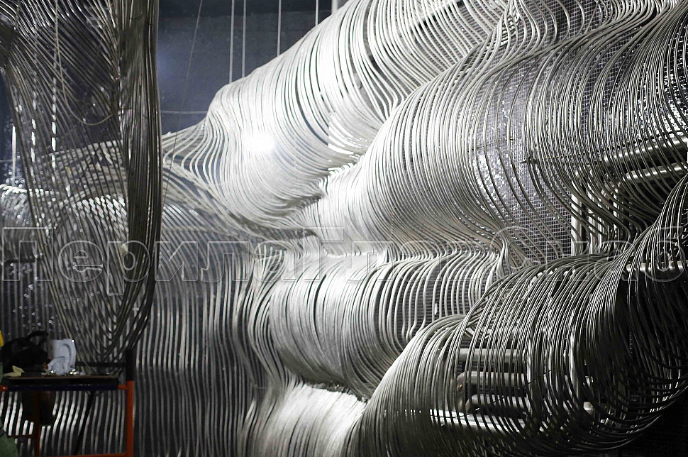 Шесть месяцев, более 150 человек, в 3 смены трудились над этим проектом. При кажущейся простоте, это очень сложная конструкция, тысяча квадратных метров 3-х мерной поверхности из нержавеющих труб 16 мм и 120 тонн льда. Каждая трубка по изгибу не похожа на предыдущие.Было много опасений за структуру льда, но удалось сделать его таким, как в Арктике.