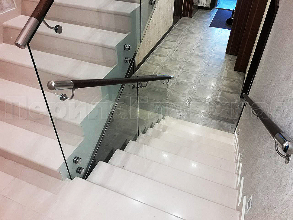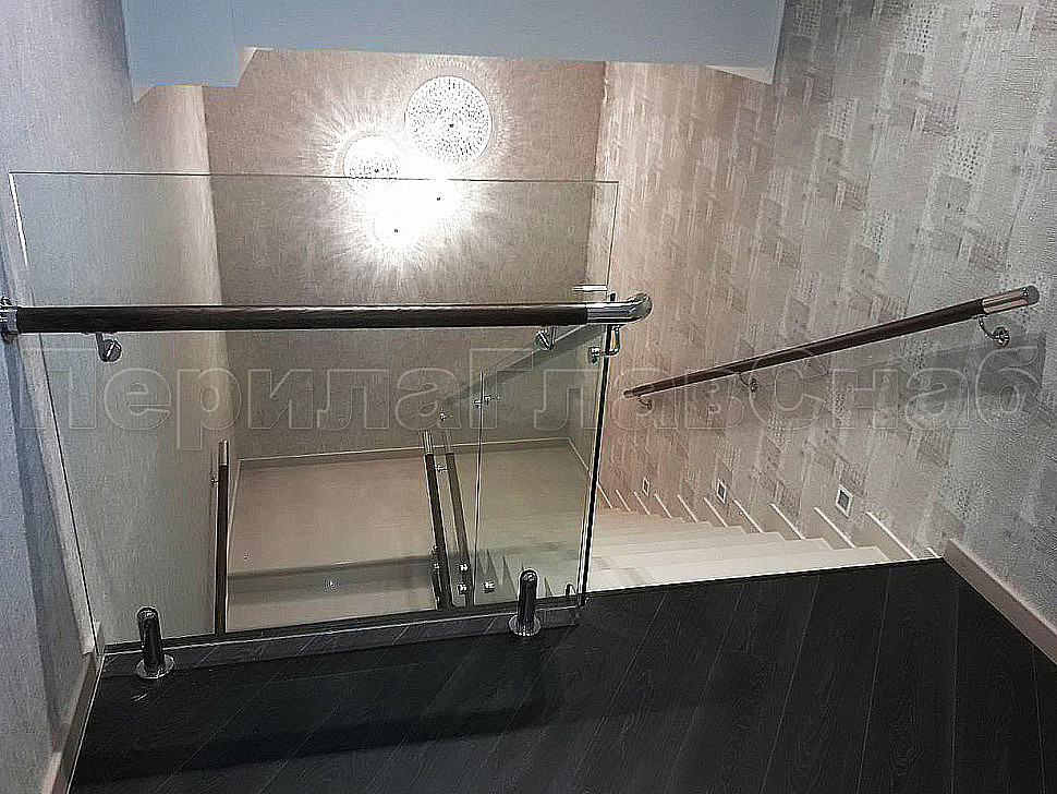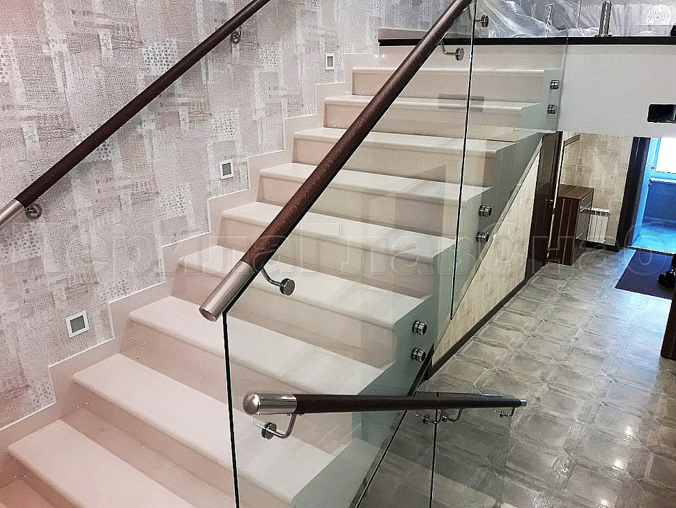 Наши заказчики сами выбирают цвет стекла, форму и материал поручня, а мы подсказываем, исходя из технических условий места установки ограждений, что лучше установить. Как например, стеклянные ограждения, которые мы установили на лестницу на точечном креплении, с деревянным поручнем на "выносе", т.е. установленный сбоку стекла. Очень надежная конструкция и главное безопасная, благодаря тому, что стекло закаленное. Главный плюс, что стекло с таким поручнем подходит под любой интерьер. Конструктив: ограждения лестницы по маршу из несущего стекла на точках. Стекло обычное, прозрачное, закаленное, толщиной 12мм с еврокромкой.