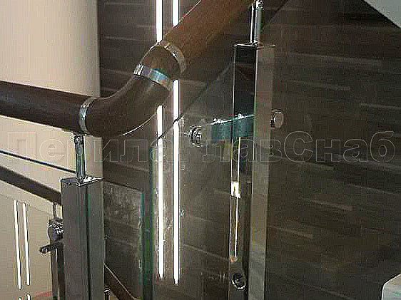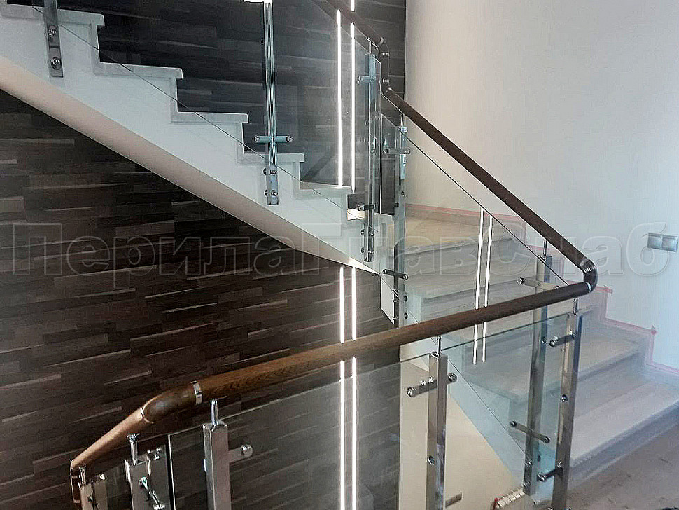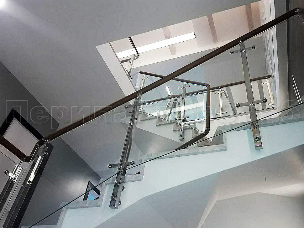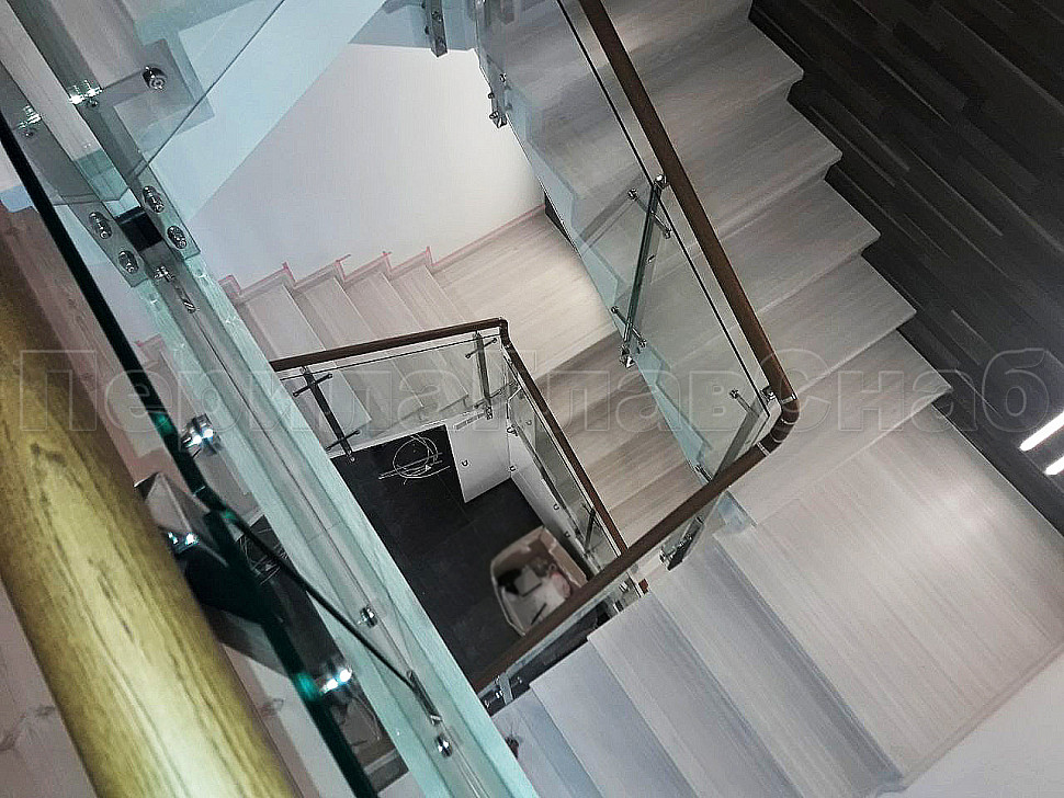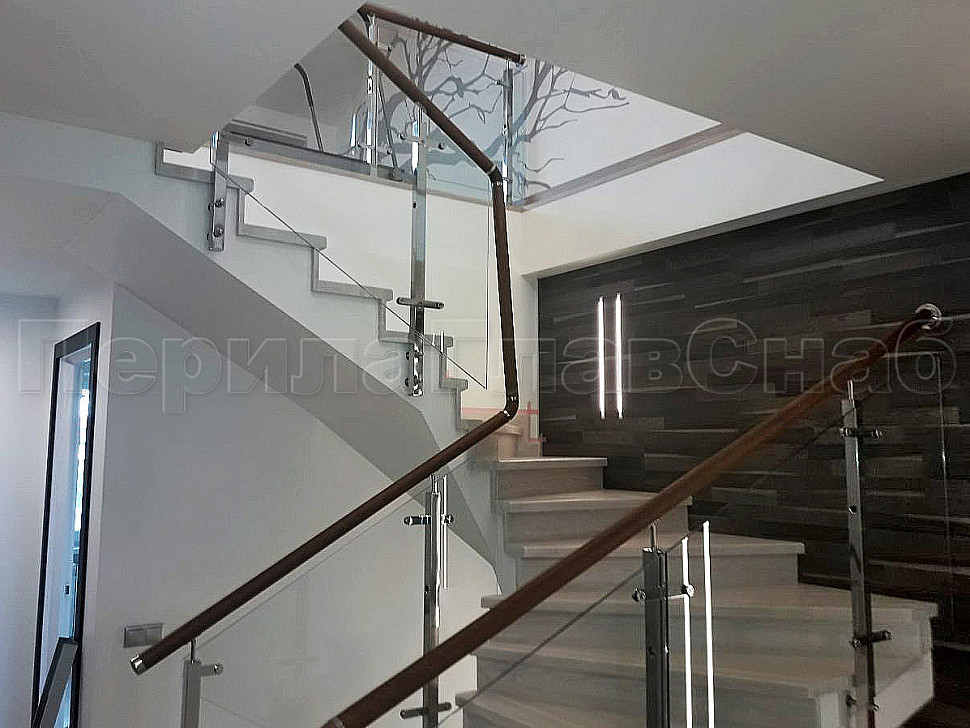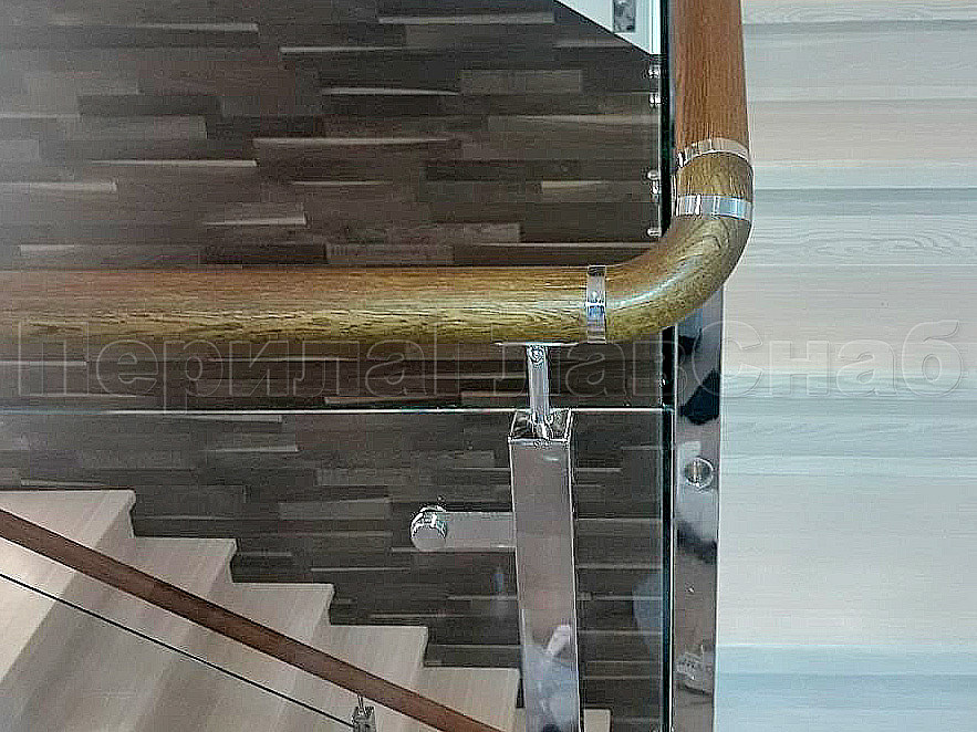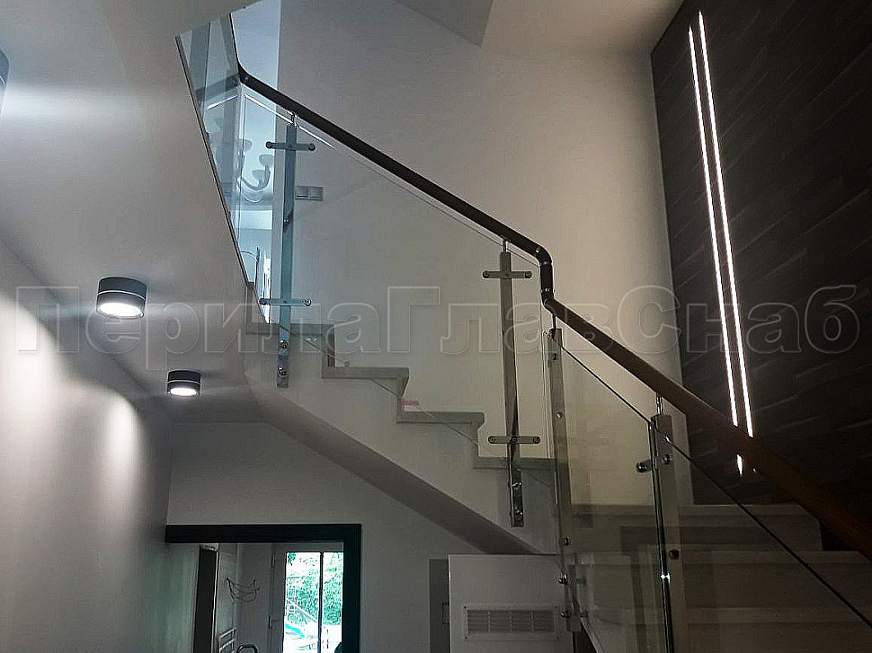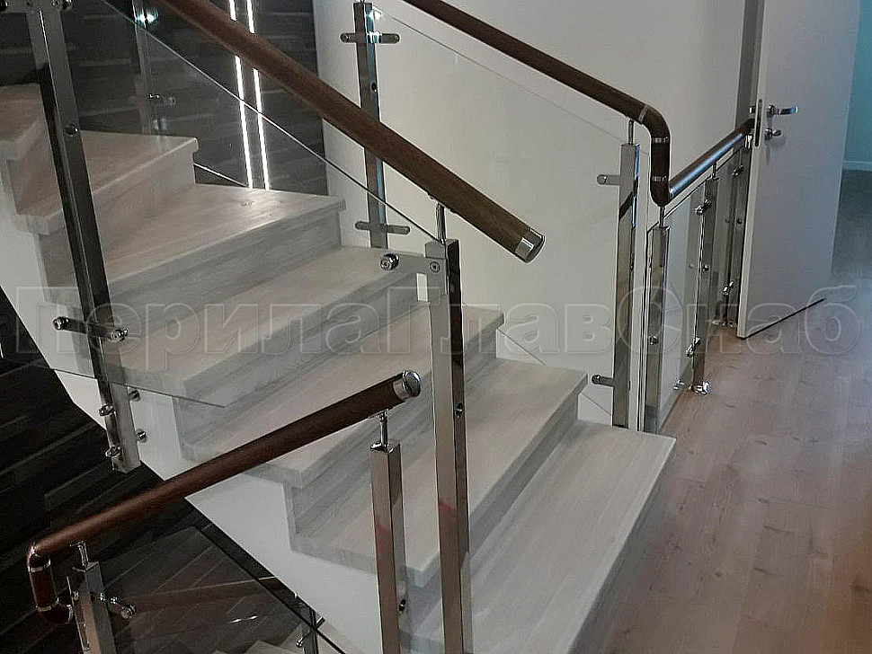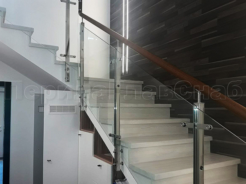Создание визуализации проекта помогает лучше понять, какую лестницу вы бы хотели видеть у себя дома. Пожелание нашего клиента было создание стеклянной лестницы с металлическими стойками и деревянным поручнем. У нас была задача для удобства прохождения по лестнице маленького ребенка, сделать дополнительные отверстия в стойках, чтобы можно было провести дополнительный тросик. Мы постарались учесть все требования и пожелания. Установили стойки с торца, тем самым сохранили как можно больше пространства на лестнице. А благодаря нашим металлическим комплектующим лестница получилась очень элегантная. Конструктив: ограждение из полированной нержавеющей стали с дубовым поручнем и стеклом по маршу в помещениях. Стекло прозрачное закаленое, толщиной 8мм., стекло крепится к стойке на пластинчатых стеклодержателях.
