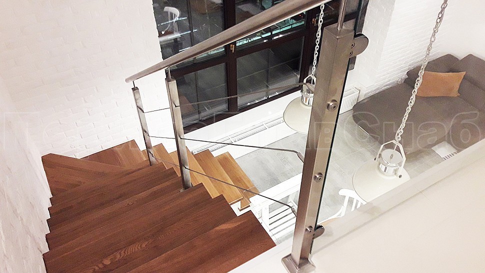 Ограждение лестницы по маршу выполнена из полированной нержавеющей стали марки Aisi 201. Высота поручня 950 мм, стойки 40х40 мм крепление сверху методом алмазного бурения устанавливаются на прямых участках 1000-1200 мм друг от друга, трос проходит сквозь стойку крепится к стойке через специальные талрепы находящиеся на крайних стойках, устанавливается равномерно по высоте стойки; поручень крепится к стоике через наконечник штырь, в начале и конце поручня заглушка.