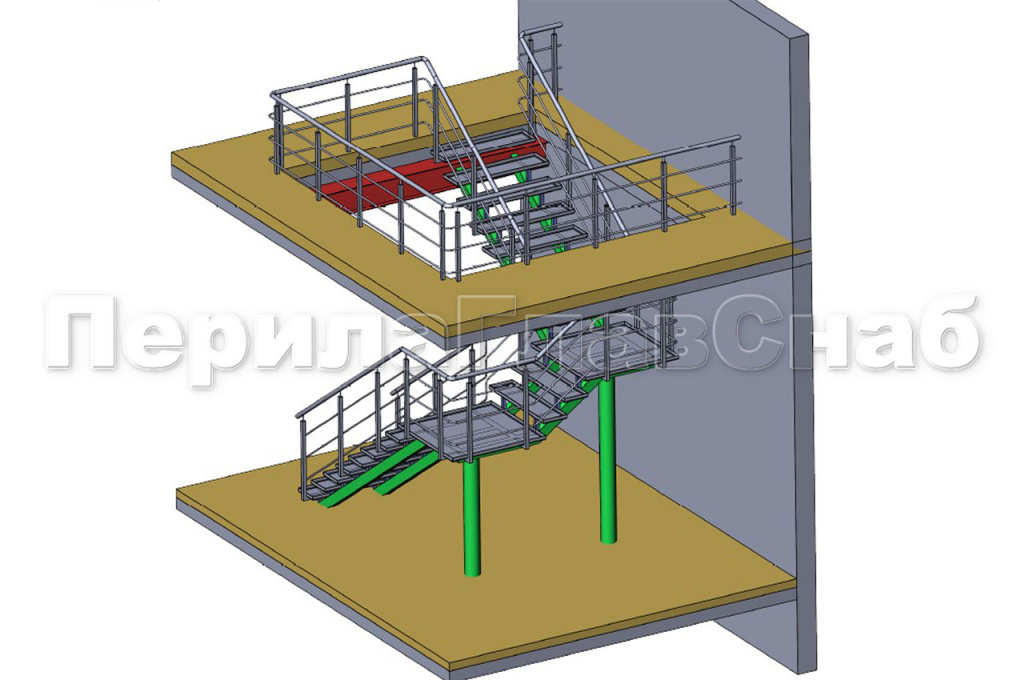 В связи с реконструкцией офисного помещения, находящегося в поселке возникла потребность в изготовлении и монтаже лестницы, высотой четыре метра, с первого на второй этаж, с двумя промежуточными площадками. К нам в компанию обратился заказчик за помощью в решении этой задачи.  На первом этапе для моделирования и составления расчетов лестницы, нашим конструкторским отделом был разработан, проект на данную лестницу. После согласования проекта с заказчиком, приступили к изготовлению и монтажу лестницы. Конструкция косоуров и площадки, выполнены из профильной трубы марки стали 3. Каркас ступени и площадки был сформирован из листа в виде корыта, для последующей заливки их бетоном. Вся конструкция лестницы сварная с последующей зачисткой швов всего металлокаркаса, шпатлевкой, грунтовкой и покраской пульверизатором по каталогу Ral. Ограждения на лестницу были выполнены из полированной нержавеющей стали. Стойки перил изготовлены из профильной трубы 40*40мм, крепились к косоуру лестницы на сварку. Поручень из трубы диаметром 50 мм крепился к стойке через наконечник штырь на сварку, поручень завязан по всей длине лестницы. Заполнение между стойками ригельное из трубы диаметром 16 мм, ригель крепился к стойке сваркой снизу. Все сварные швы ограждения были зачищены и заполированы. С задачей справились. Работы по изготовлению и монтажу лестницы и перил, были выполнены в течение шестидесяти рабочих дней.