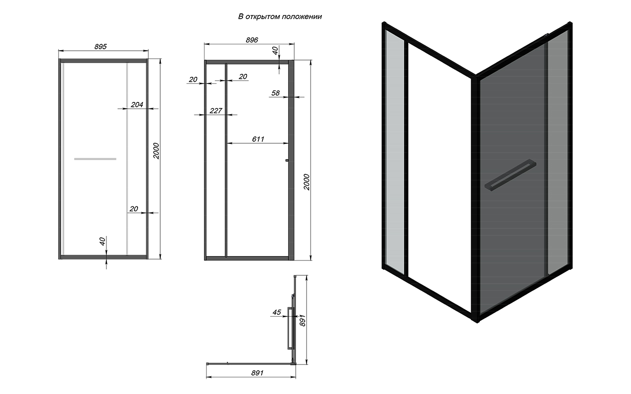 Комплект душевой с внутренней подвижной дверью, толщина стекла 8мм, 900х900х2000, AUSI 304, черная