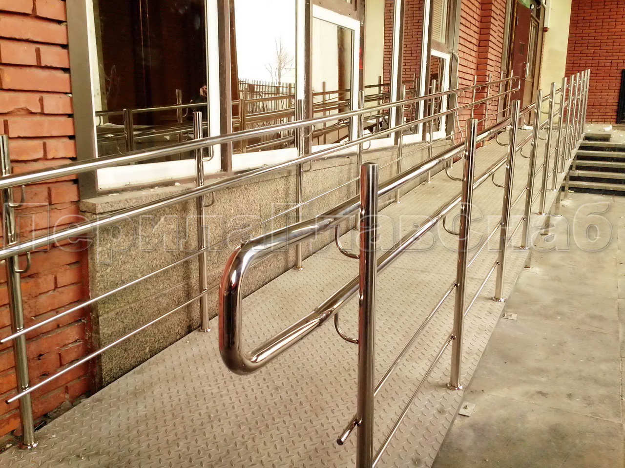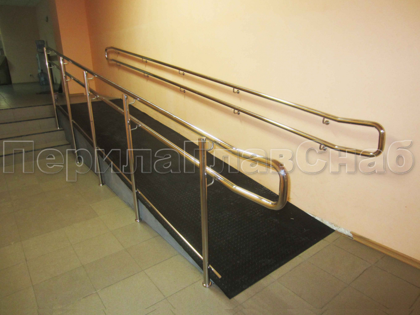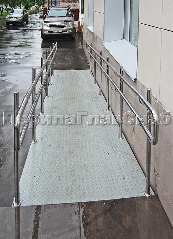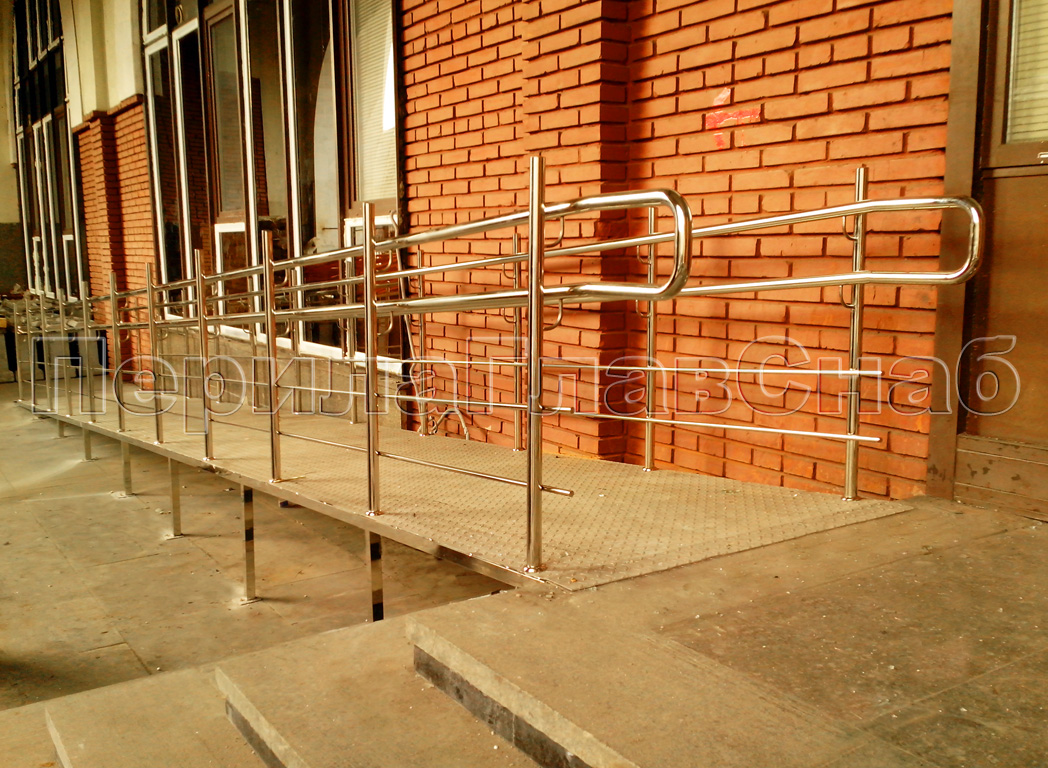 Пандус "П-образный", функцию нижнего ограничителя выполняют 2 ригеля д.16 мм, соединенные между собой в начале и в конце линии ограждения