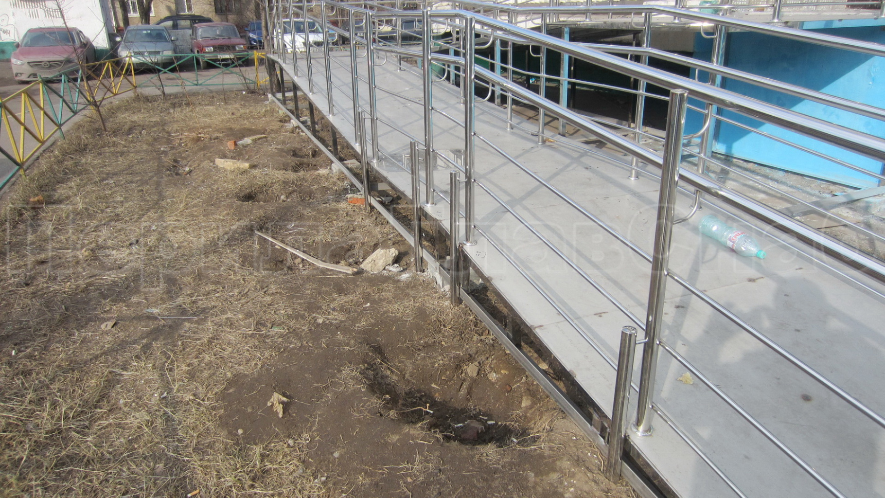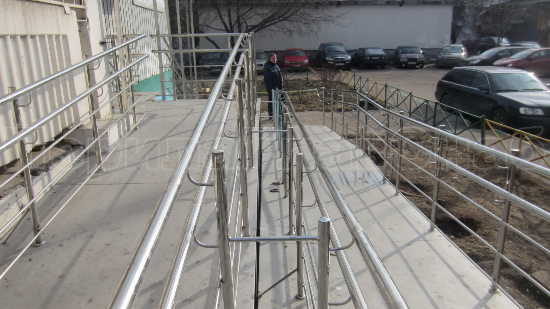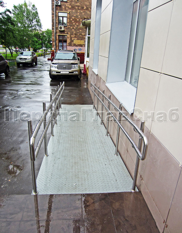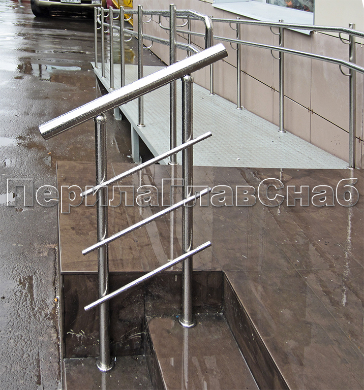 Пандус "Г-образный" с входной группой, окончание двух поручней и двух ригелей соединены между собой