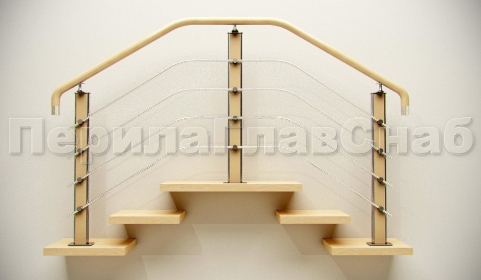 Четыре ригеля на держателях, квадратный деревянный поручень и квадратные стойки