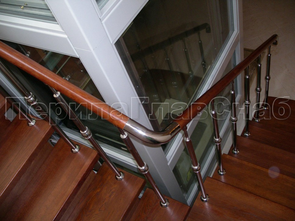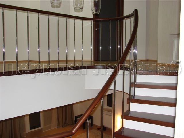Нержавеющие ограждения без ригелей с круглым деревянным поручнем и стойками с деревянными вставками