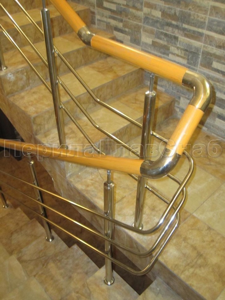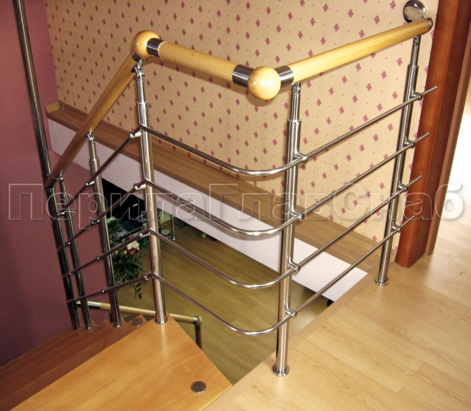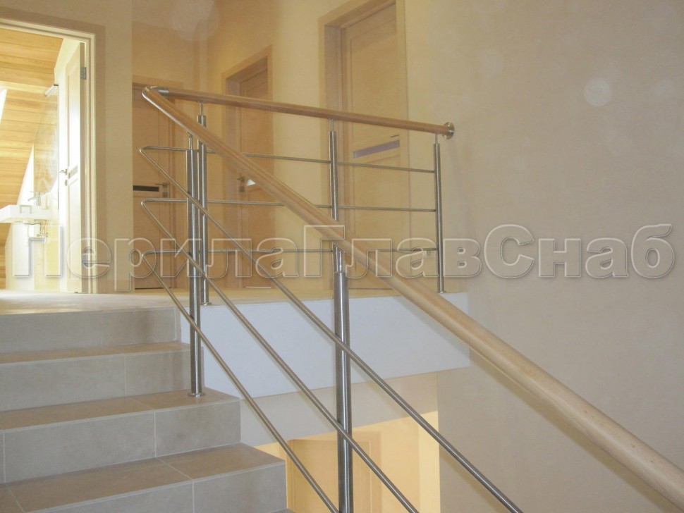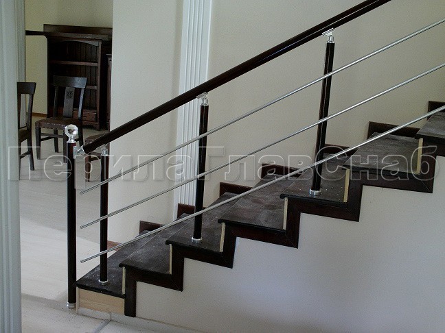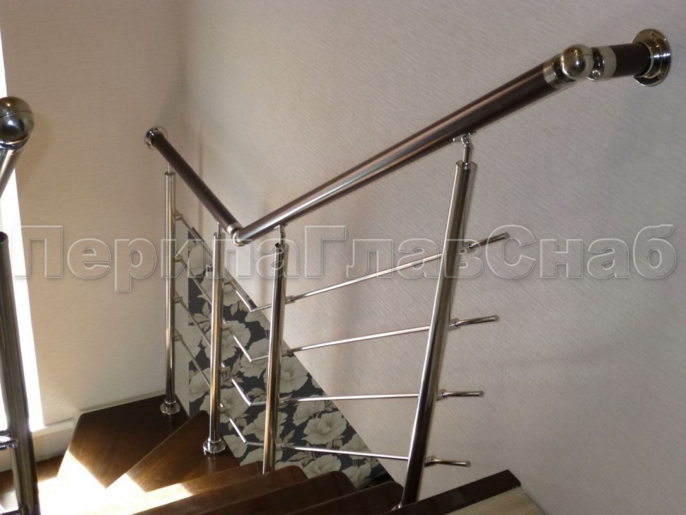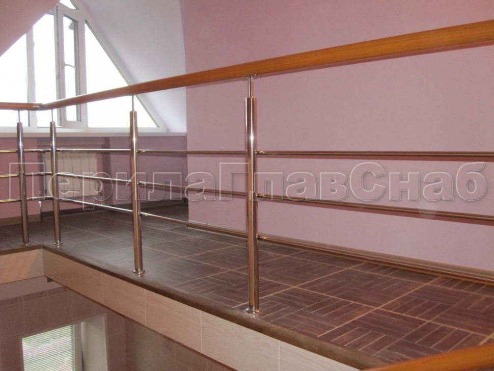 Нержавеющие ограждения без ригелей с круглым поручнем и стойками с деревянными вставками