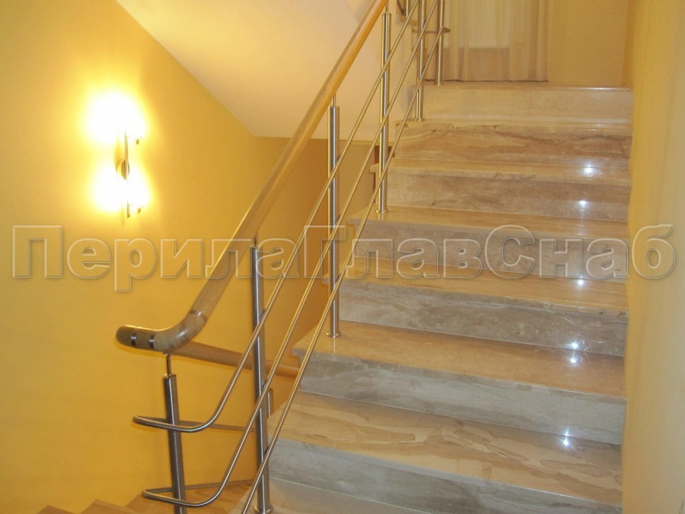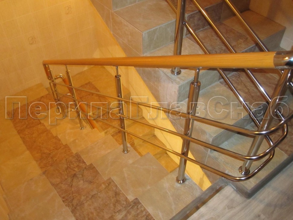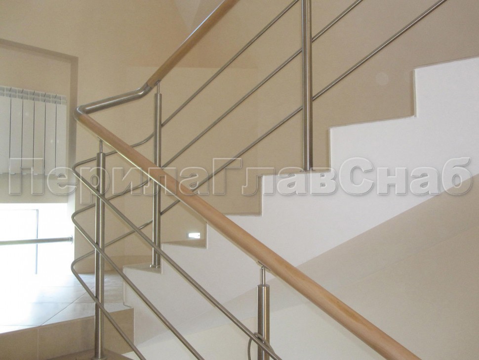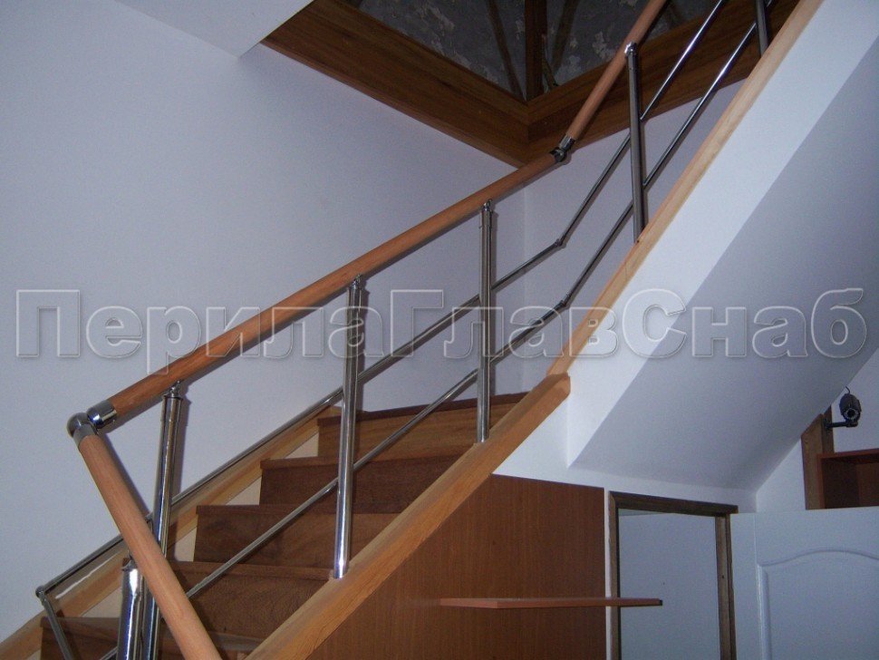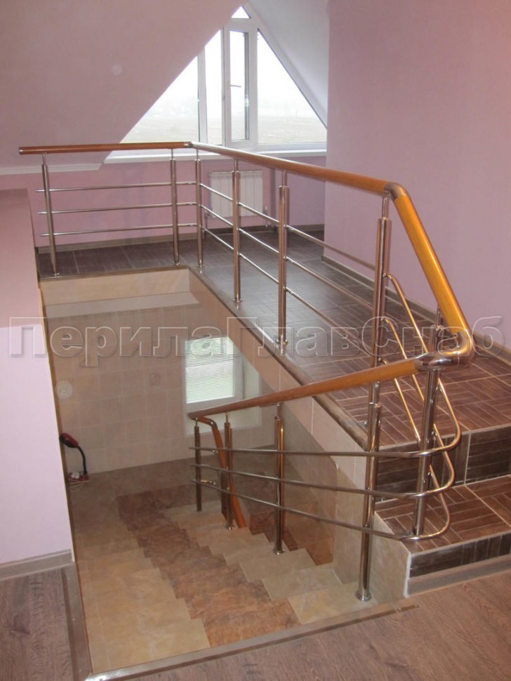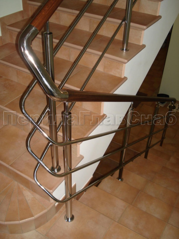 Нержавеющие ограждения без ригелей с круглым поручнем и стойками с деревянными вставками