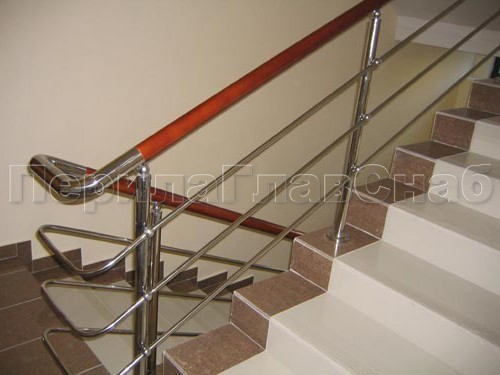 Три ригеля на сварке, квадратный деревянный поручень и круглые стойки
