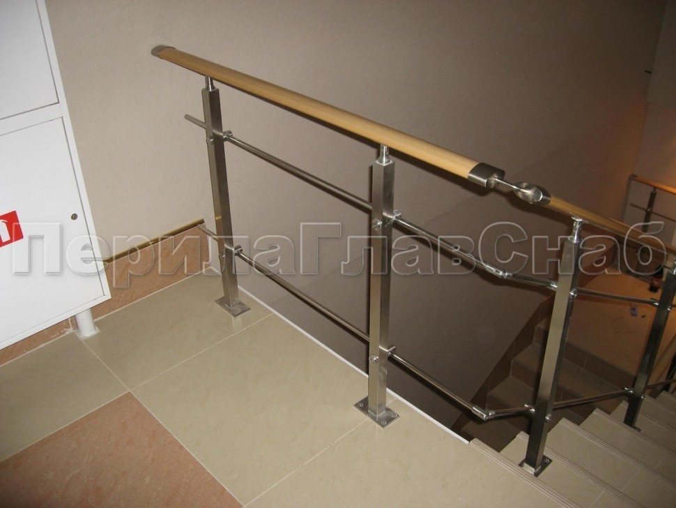 Четыре ригеля на держателях, квадратный деревянный поручень и квадратные стойки