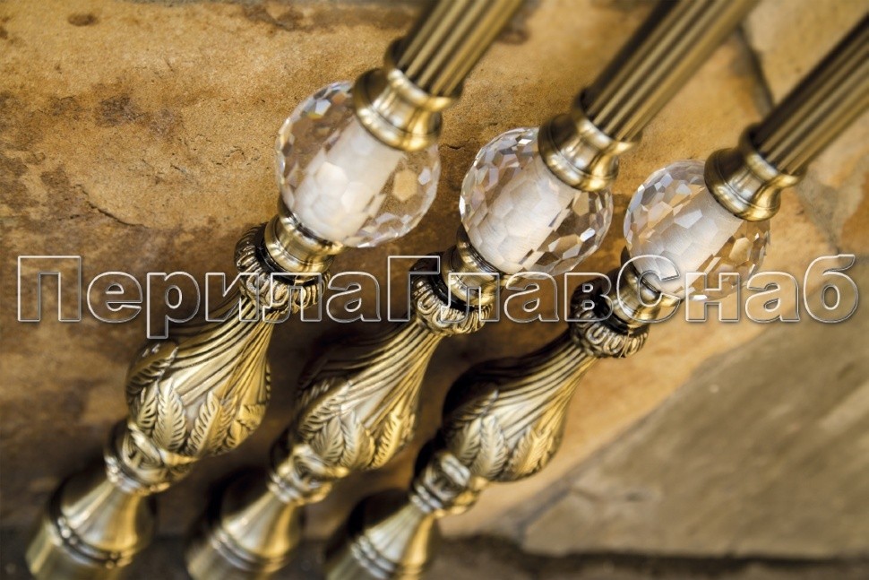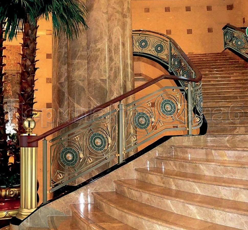 - Перила из латуни отличаются высокой прочностью. Металл не меняет своих свойств под воздействием коррозийных процессов, поэтому конструкции из него будут радовать вас не один десяток лет. Единственный признак старения латуни — это появление благородного зеленоватого оттенка на поверхности изделий. Сохранить первозданный внешний вид конструкций позволит соблюдение основных правил ухода.