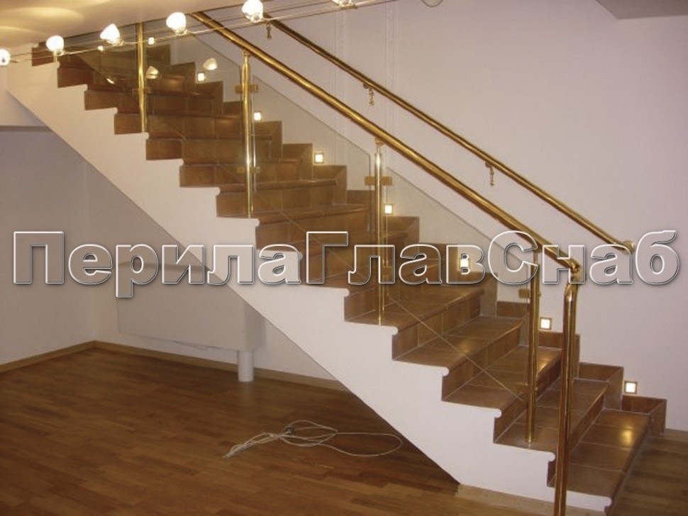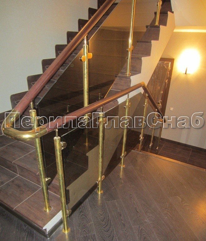 - Латунные перила выглядят изящно и дорого. Особенно гармонично такие конструкции сочетаются со стеклом оттенка бронза. Богатый выбор стилистических решений позволяет без труда подобрать оптимальный вариант.