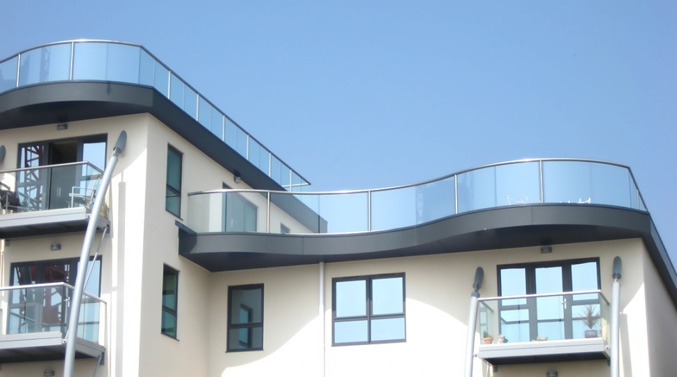 Самонесущие ограждения из стекла с креплением в алюминиевый профиль. Устанавливаются согласно требованиям ГОСТов на крышах и эксплуатируемых кровлях. Могут устанавливаться как на плиту перекрытия, так и на специальный парапет.