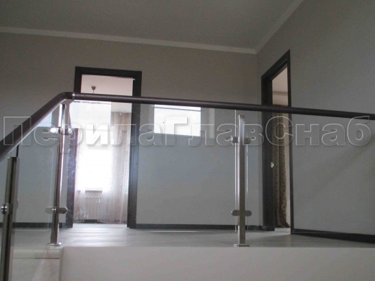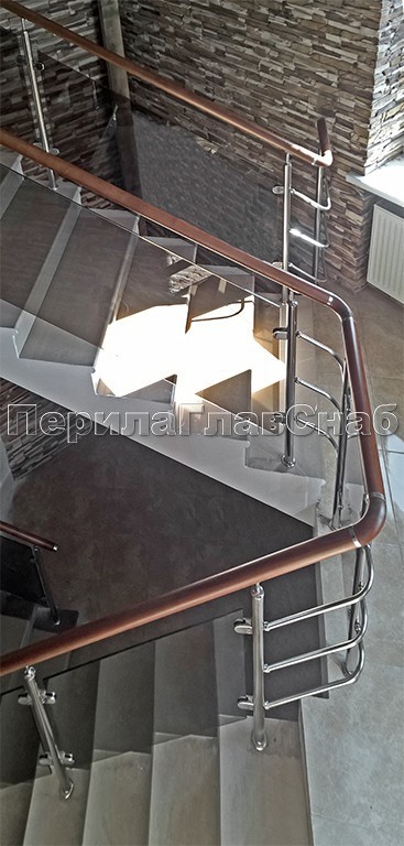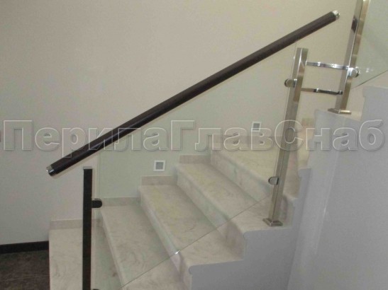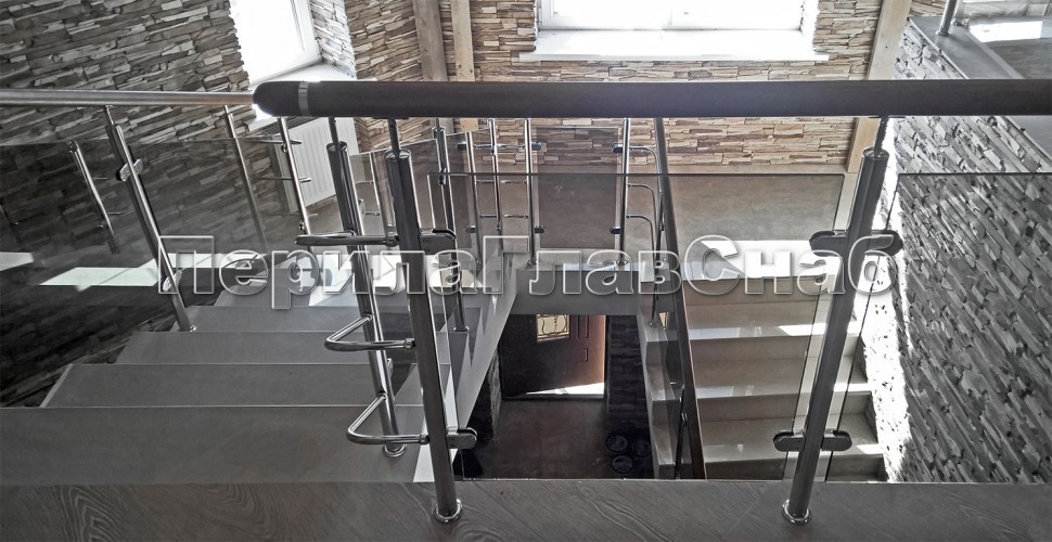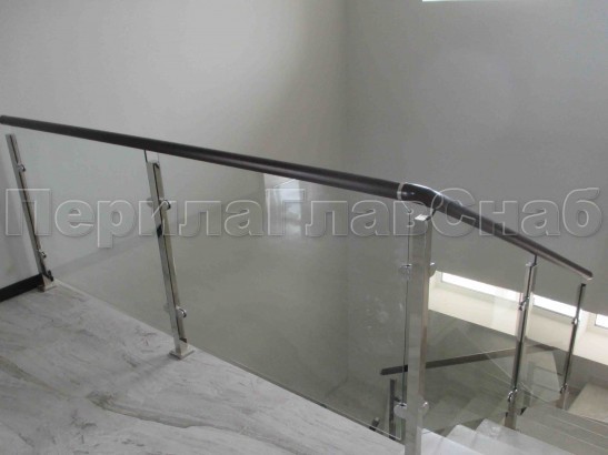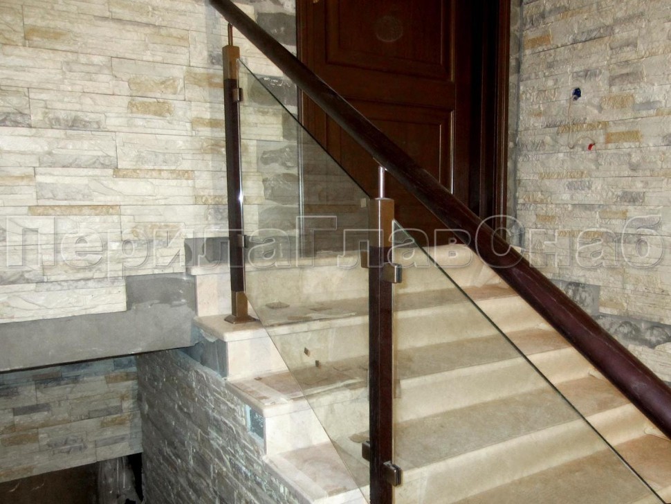 Ограждение лестницы со стеклом, тонированным в массе, стойки и завязки поручня из латуни
