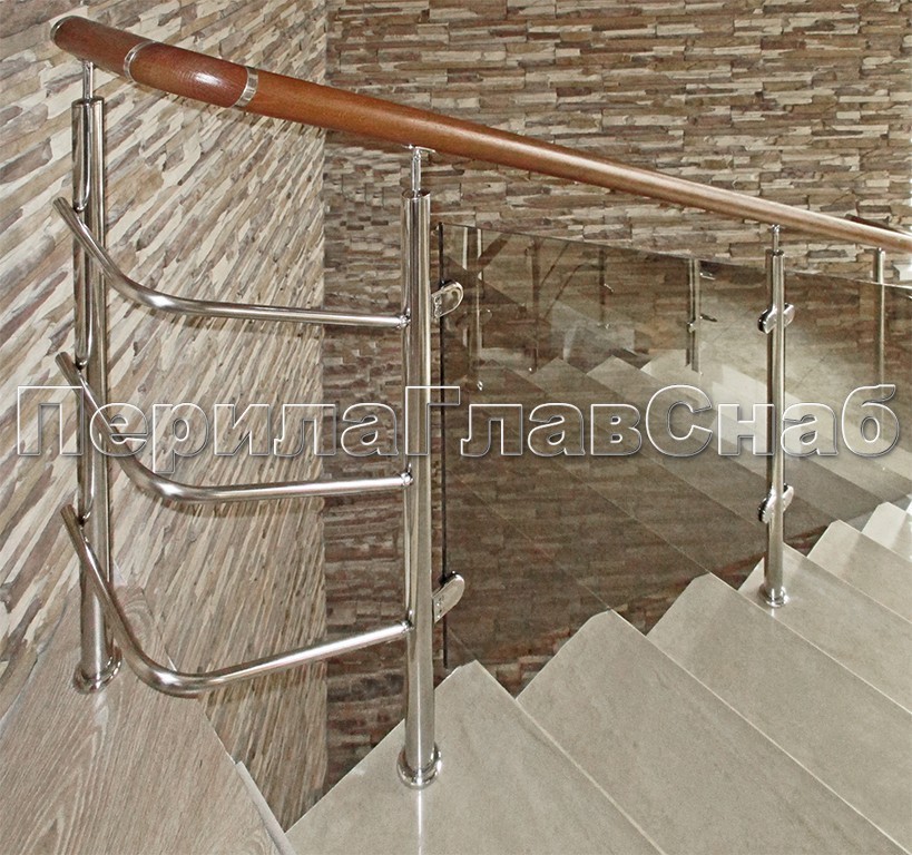 Нержавеющие ограждения без ригелей с круглым поручнем и стойками с деревянными вставками