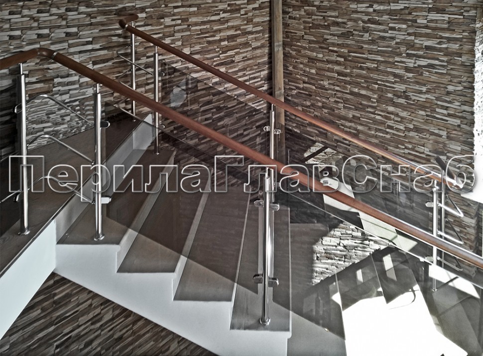 Четыре ригеля на держателях, квадратный деревянный поручень и стойки с деревянными вставками