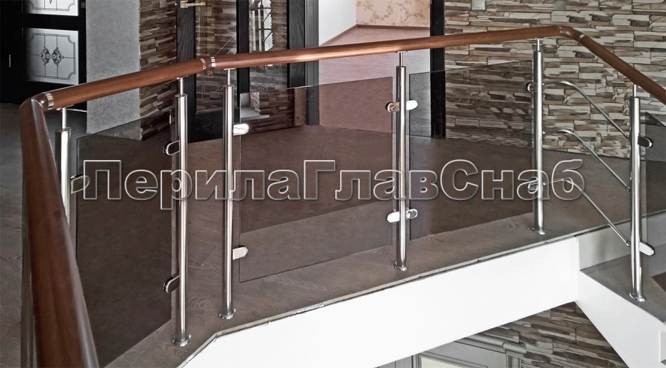 Нержавеющие ограждения без ригелей с круглым деревянным поручнем и стойками с деревянными вставками