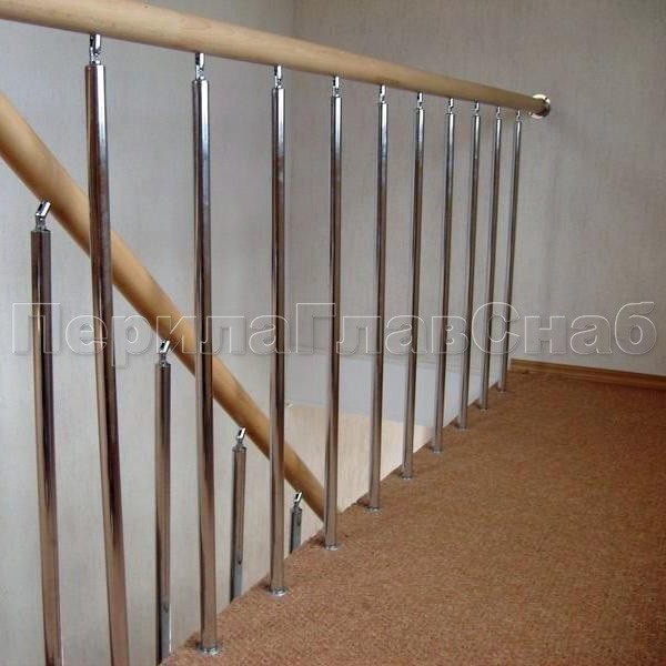 Три ригеля на сварке, квадратный деревянный поручень и круглые стойки