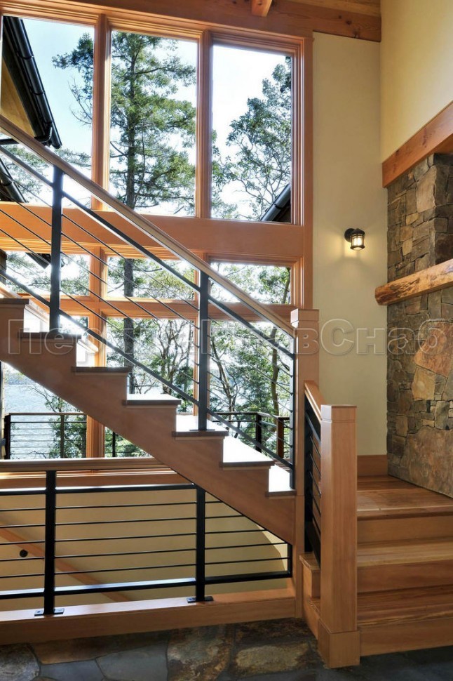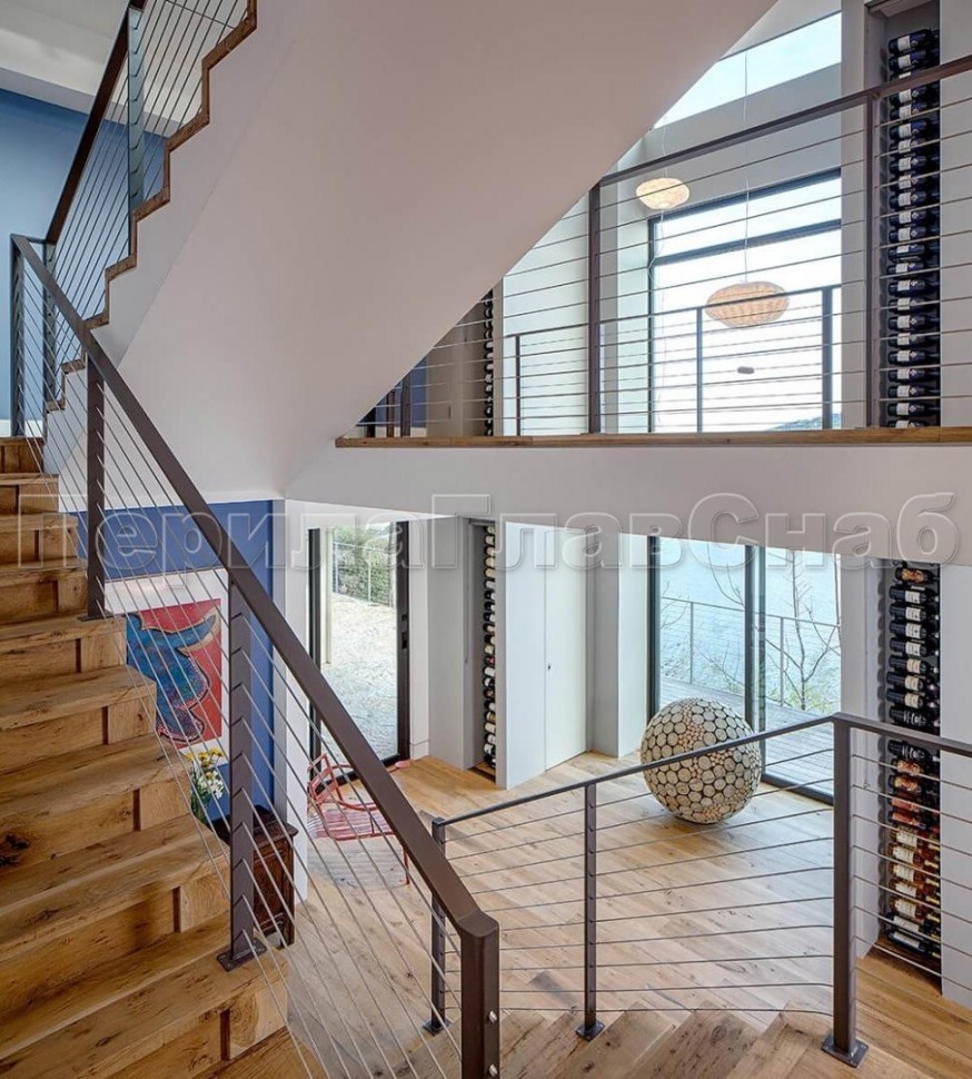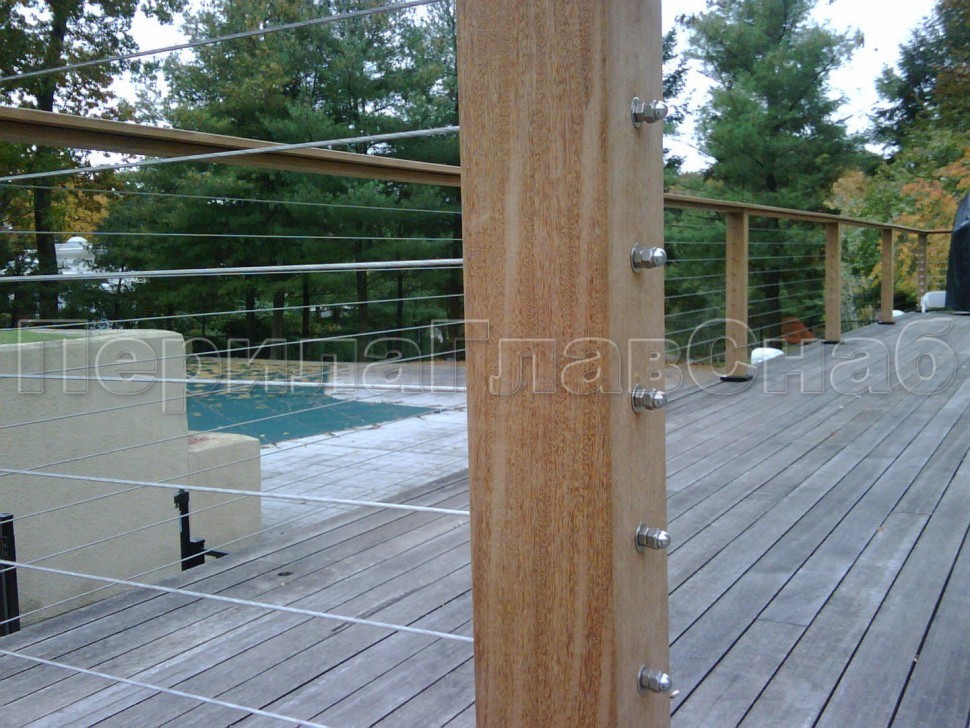 Нержавеющие ограждения без ригелей с круглым деревянным поручнем и стойками с деревянными вставками