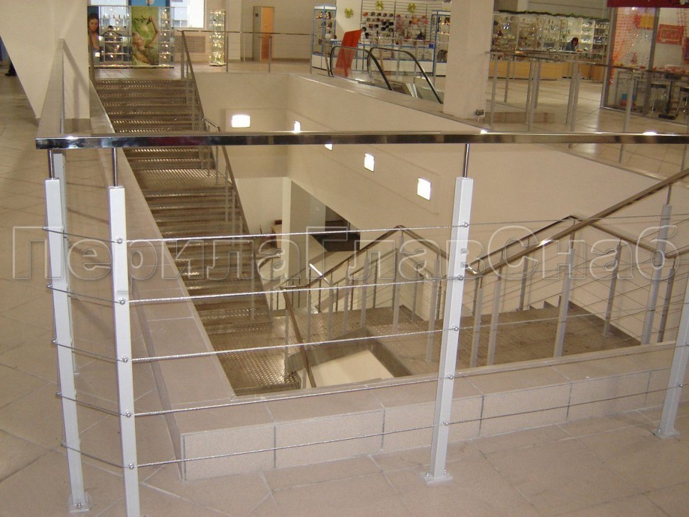 Ограждения из нержавейки. Заполнение из 4х тросиков. Квадратные стойки.