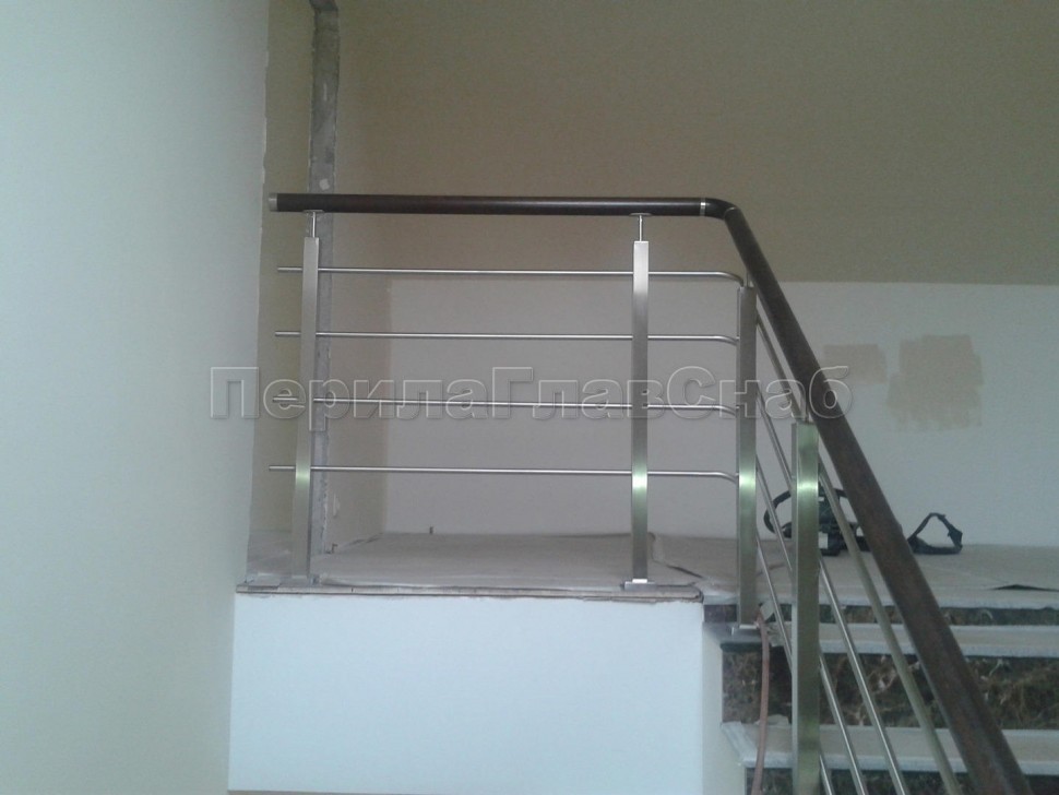 Четыре ригеля на держателях, квадратный деревянный поручень и квадратные стойки