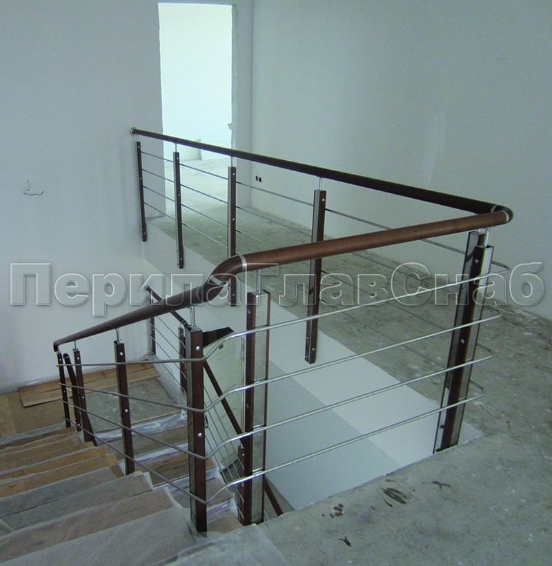 Три ригеля на сварке, квадратный деревянный поручень и круглые стойки