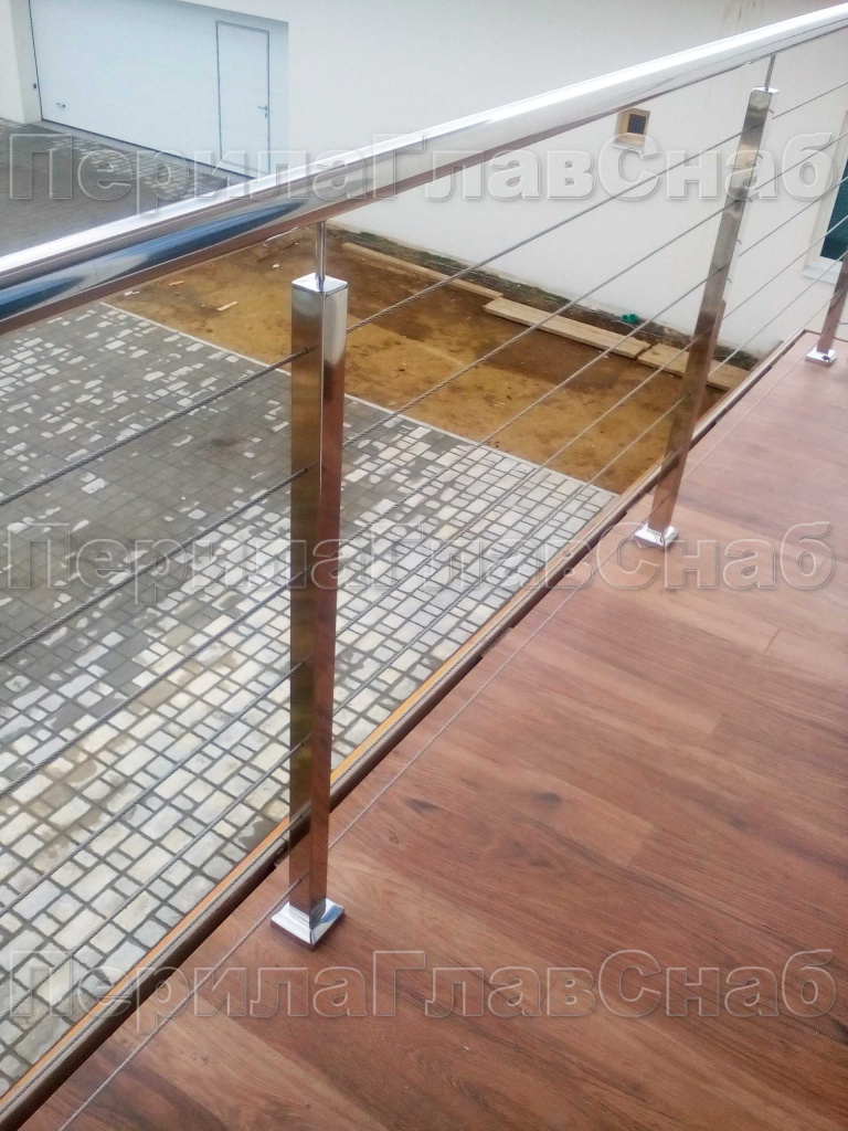 Ограждения из нержавейки. Заполнение из 4х тросиков. Квадратные стойки.